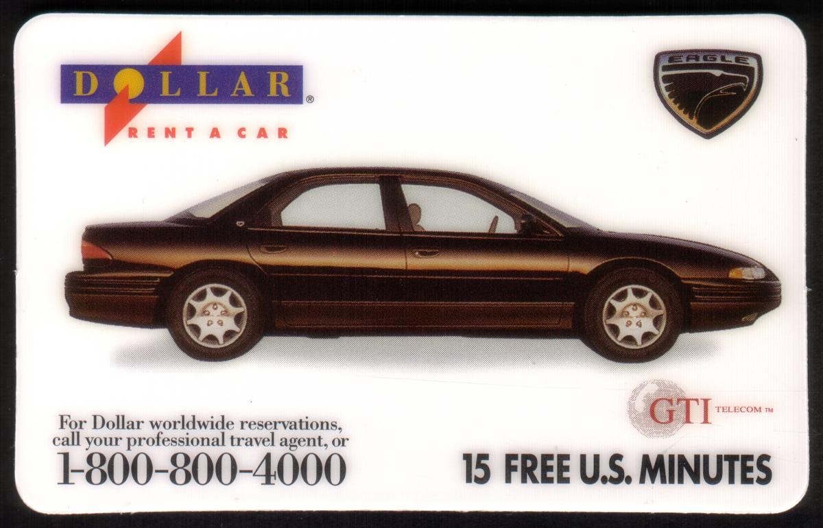 The card includes branding for Dollar Rent-A-Car, with a clear reference to "15m Dollar Rent-A-Car: 1995 Chrysler Eagle Vision," which indicates the card’s association with transportation and travel services. The logos for Chrysler Eagle and Dollar Rent-A-Car appear on the card, reinforcing its automotive and rental car promotional theme. Additionally, the card bears the GTI Telecom, Inc. logo, identifying the telecommunications company connected to the card’s issuance.