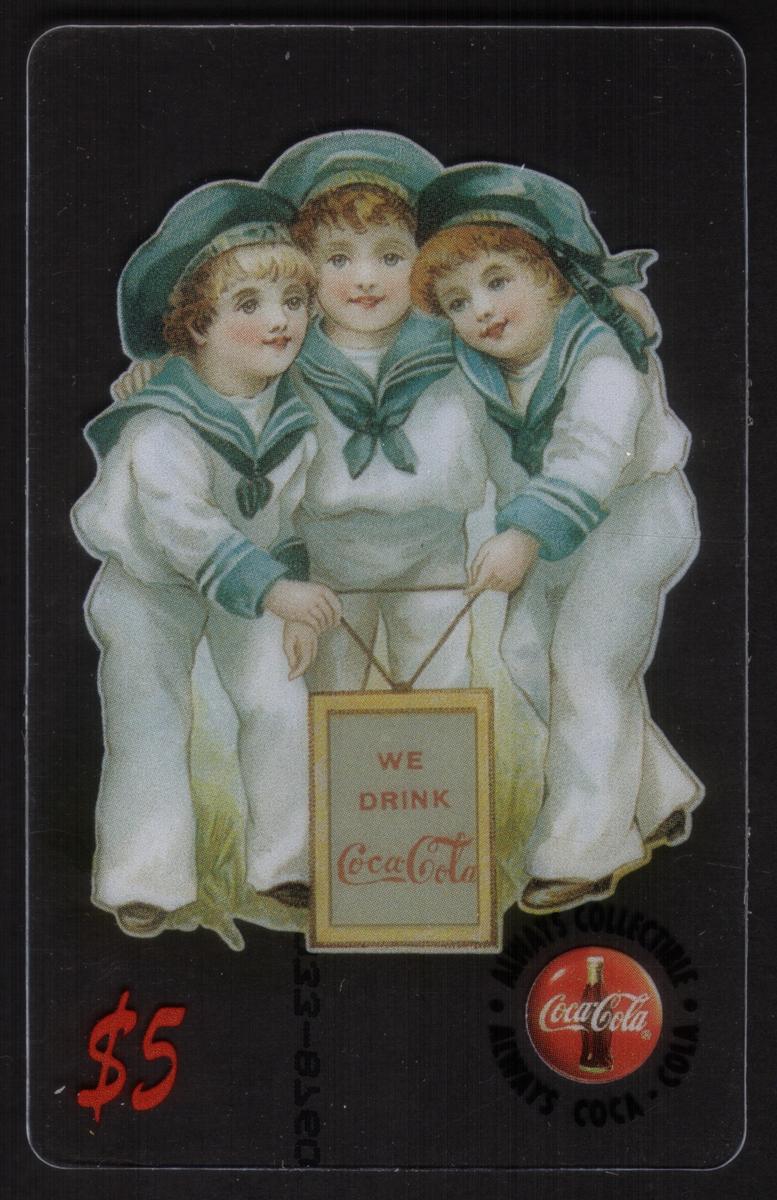 This collectible card prominently features three small sailor boys standing side by side, each holding a rectangular sign with the iconic red Coca-Cola logo on a white background. The boys wear traditional sailor outfits, including blue and white hats and navy blue collars with white stripes. Their facial expressions are cheerful, and they appear to be smiling directly at the viewer. The artwork is rendered clearly on a smooth acetate surface, giving the image a glossy, transparent effect.