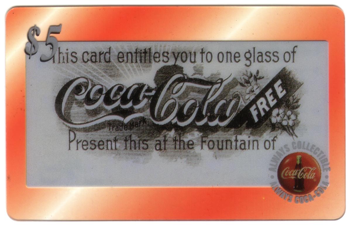 This collectible card features a prominent Coca-Cola logo centered within a rectangular etched acetate window. The card includes the text "$5" in the upper left corner, followed by the words "this card entitles you to one glass of" above the large Coca-Cola script logo. The word "FREE" appears in a diagonal banner overlapping the logo. Beneath this, it reads "Present this at the Fountain of" indicating the card’s use as a free Coca-Cola sampling coupon.