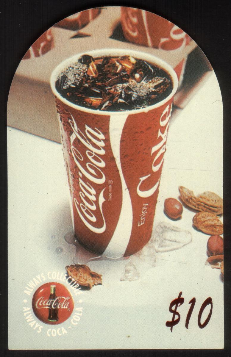 This collectible phone card features a design that prominently includes multiple Coca-Cola logos and Coke logos. The card has a die-cut, top-rounded tombstone shape. The central image shows a cup filled with Coca-Cola, accompanied by peanuts, emphasizing a casual snack theme. The cup of Coke and the peanuts are the main visual focus, situated clearly against a solid background.