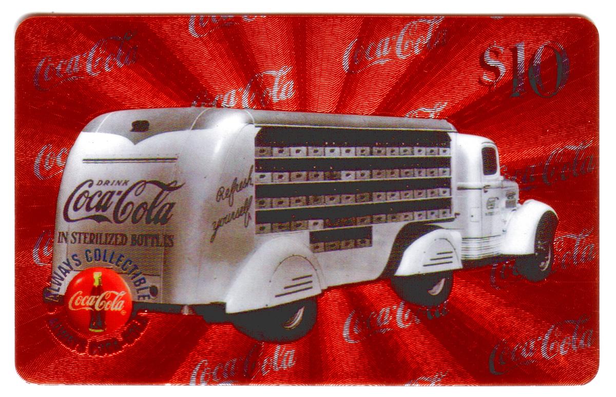 This card has a denomination value of $10 shown in the upper right corner. A red circular emblem with a single Coca-Cola bottle appears on the lower left of the card, reinforcing its theme centered on Coca-Cola’s branding. The card’s glossy finish and color arrangement emphasize the classic Coca-Cola style and the nostalgia associated with antique Coke trucks.