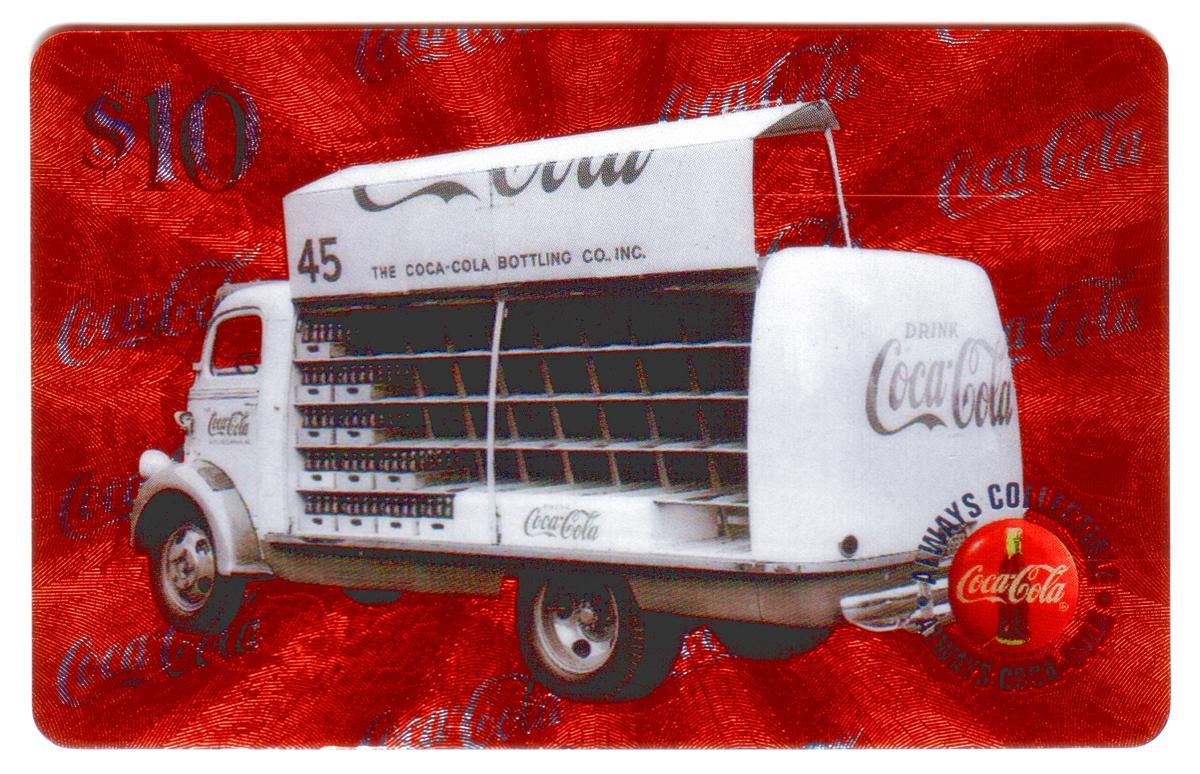 Overall, the card combines the iconic Coca-Cola branding with a historical automotive vehicle, making it a collectible item that celebrates vintage Coke delivery trucks alongside the well-known logos associated with the brand.
