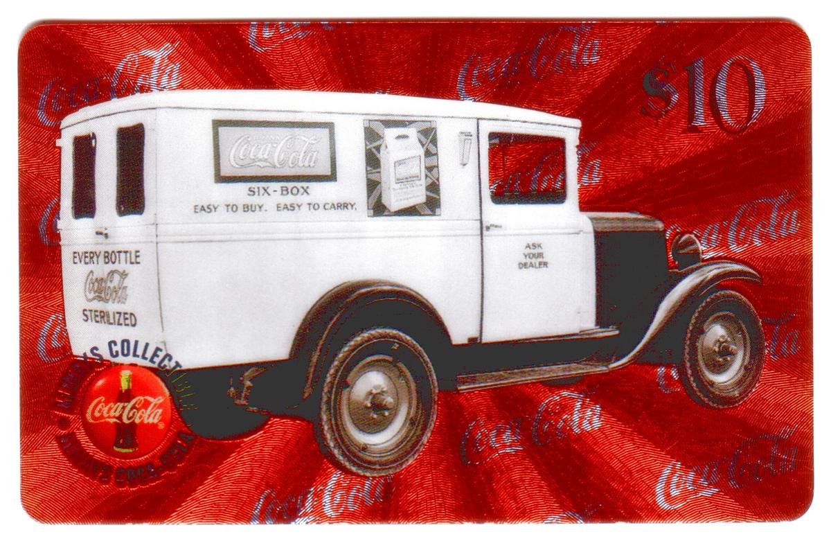 Overall, the card celebrates Coca-Cola’s heritage in beverage distribution by featuring a classic delivery truck with recognizable logos and slogans. The focus is on the brand's historic automotive delivery method and the collectible value of the phone card itself.