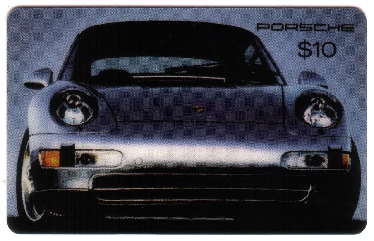In the upper right corner of the card, the word "PORSCHE" is printed in bold, uppercase letters along with the denomination "$10," indicating the card's value. The background is a smooth gradient of blue, which accentuates the car's metallic finish and gives the card a polished, modern appearance.
