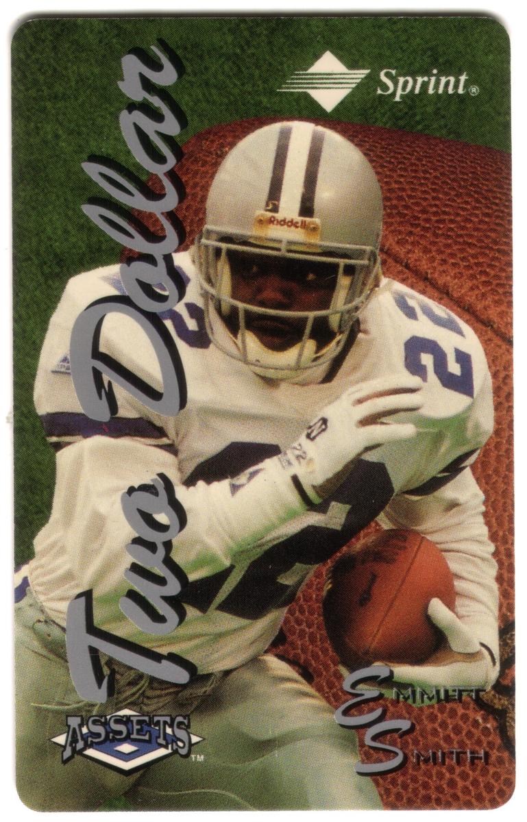 "Two Dallas" is prominently displayed in script style along the left side of the card, with the word "ASSETS" and a small logo beneath it. The Sprint logo appears near the top right corner. At the bottom right, the name "EMMITT SMITH" is printed in a stylized font with the initials "ES" above it.