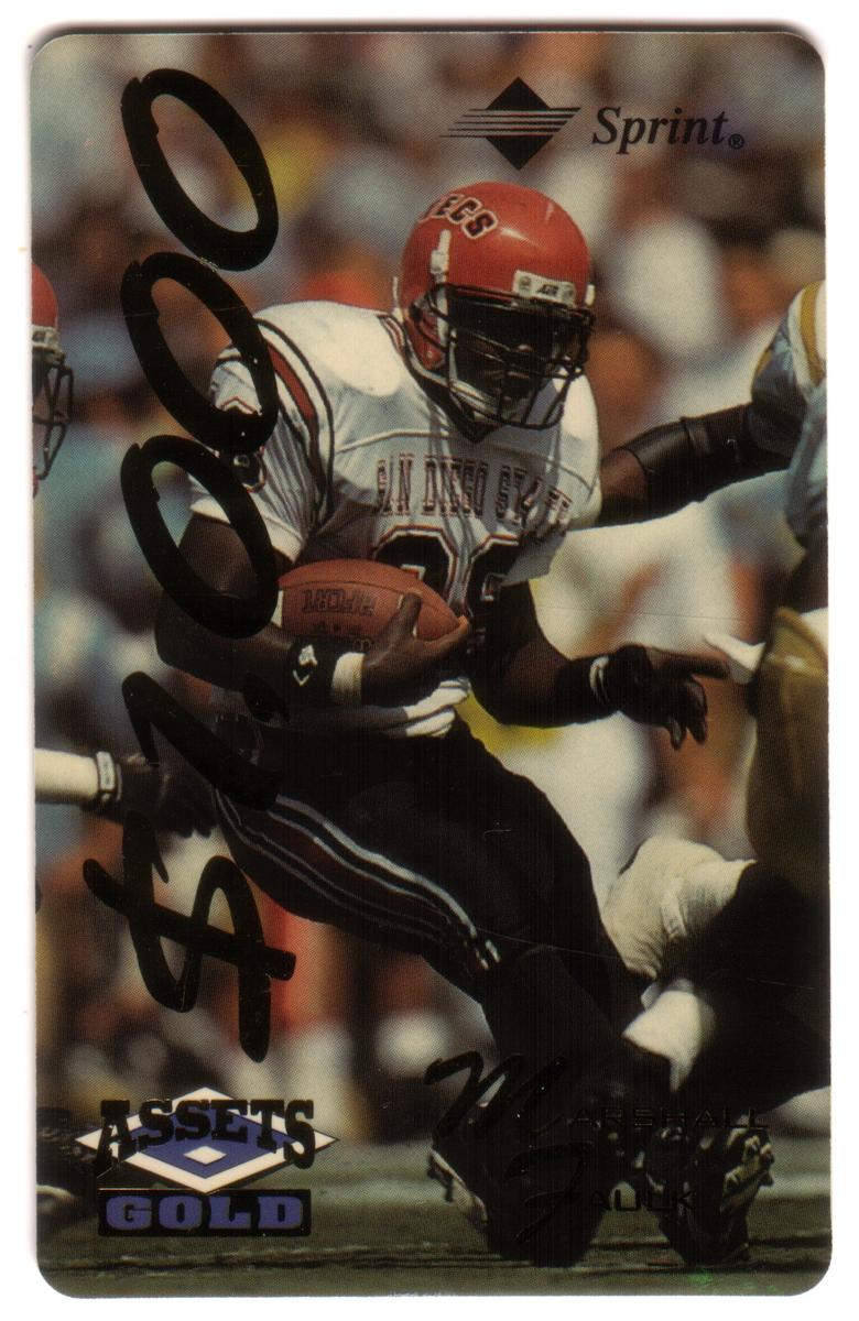 Text on the card clearly identifies Marshall Faulk by name, linking the image to the well-known professional football player. The card’s branding and graphics strongly connect it to the NFL and football sports genre, positioning it as a collectible item celebrating Marshall Faulk within the framework of National Football League athletics.