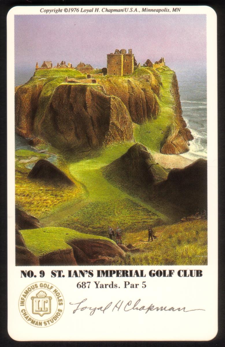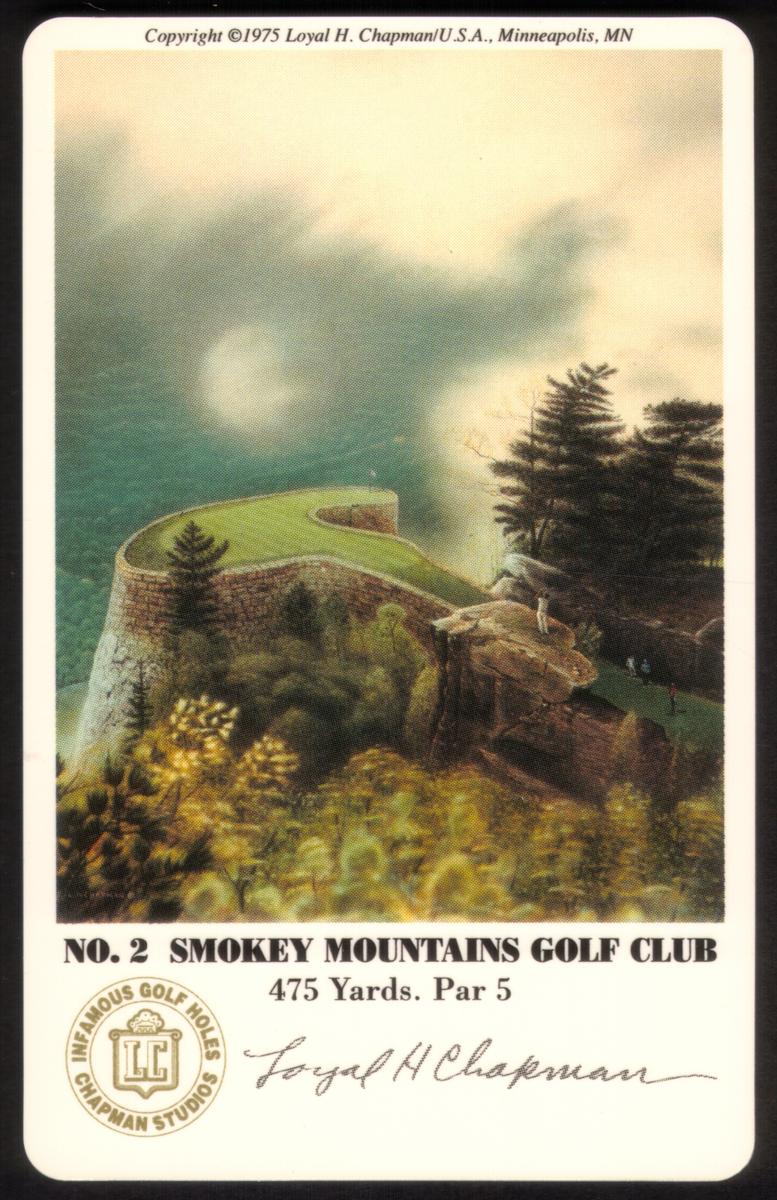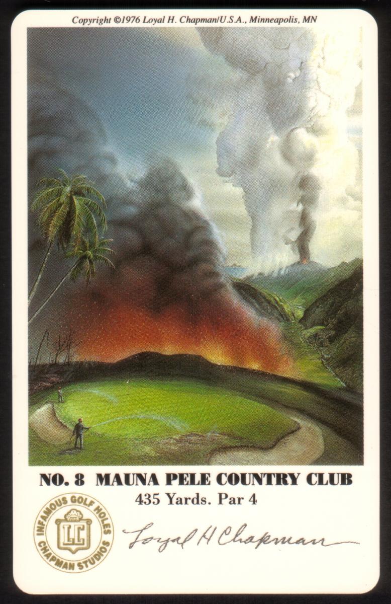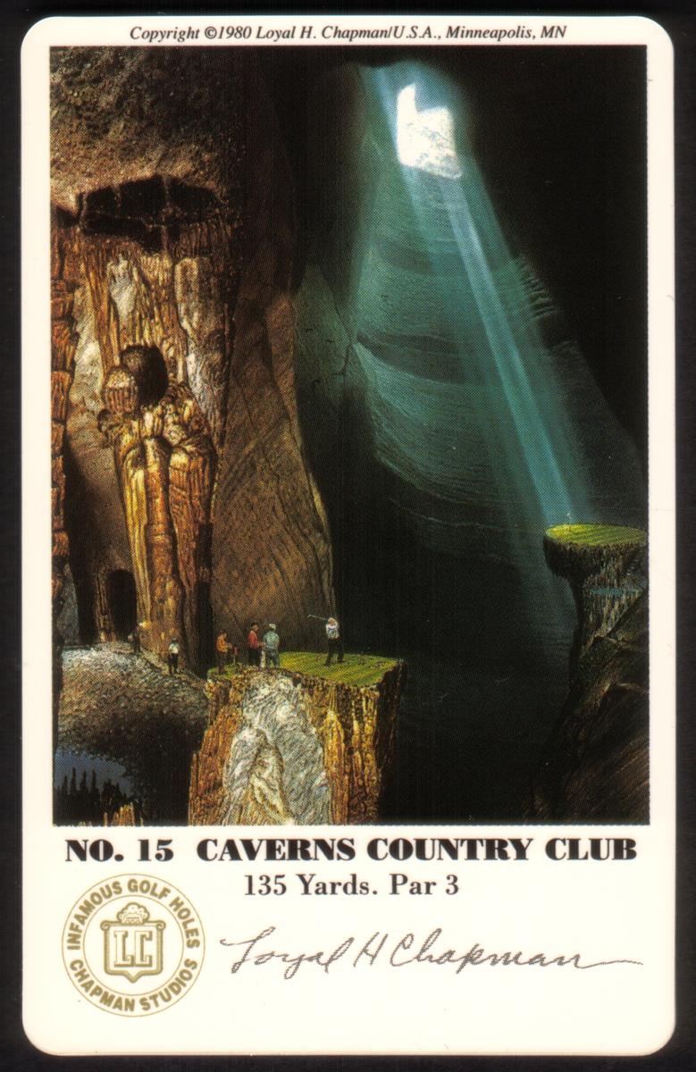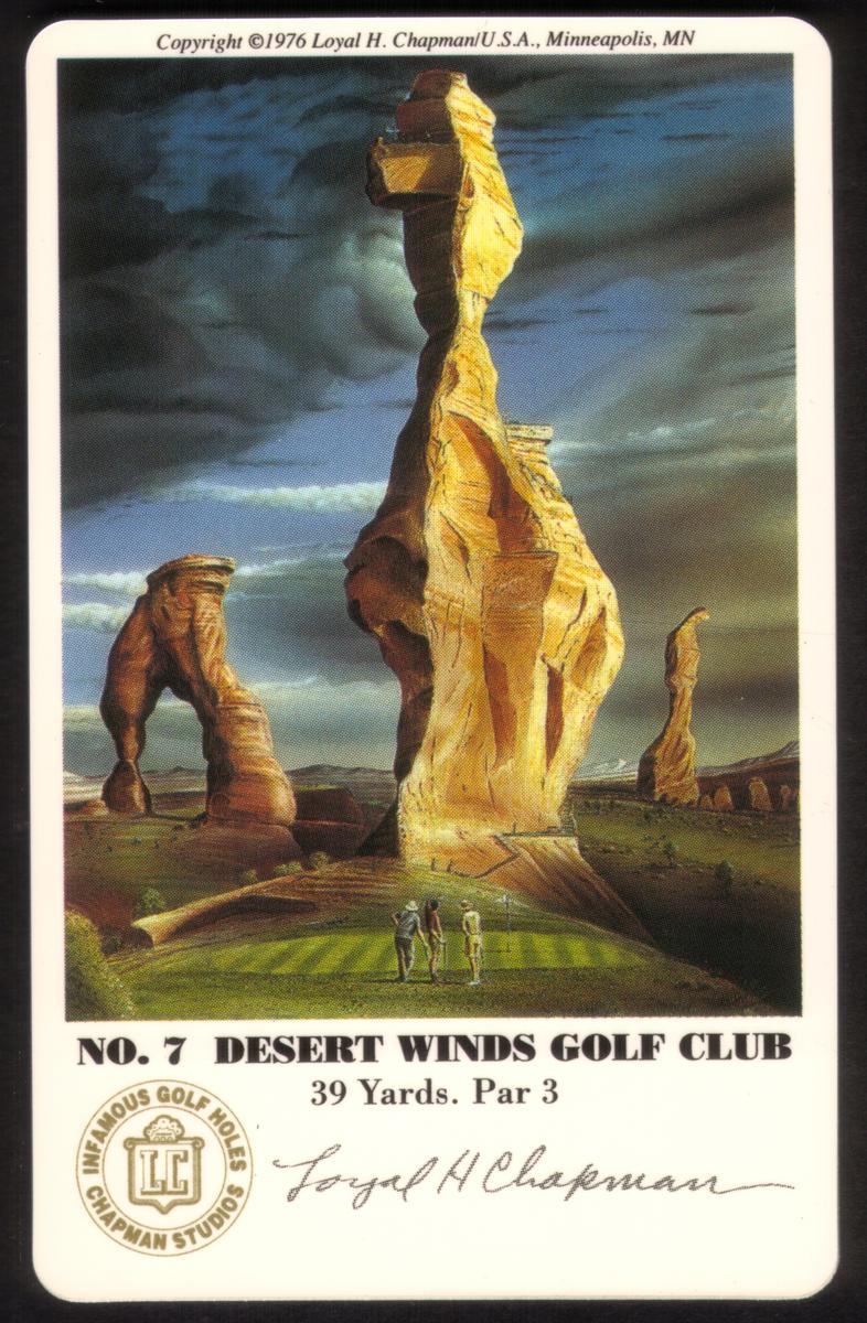 This collection of 18 golf-themed collectible cards features artistic and scenic renderings of fantasy golf holes at well-known and imaginative golf clubs, created by Loyal H. Chapman and copyrighted between 1975 and 1980 in Minneapolis, MN. Each card displays the name of the golf club, hole number, yardage, par information, and Loyal H. Chapman's signature, accompanied by the Chapman Studios emblem labeled "Infamous Golf Holes." The artwork combines natural and dramatic landscapes with detailed golf course elements, portraying golfers actively engaging with the holes.