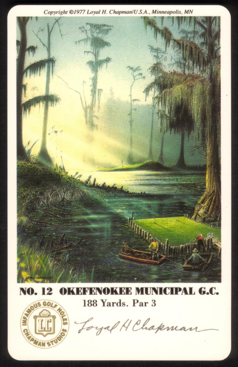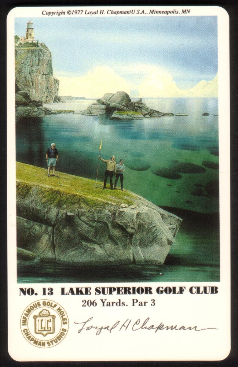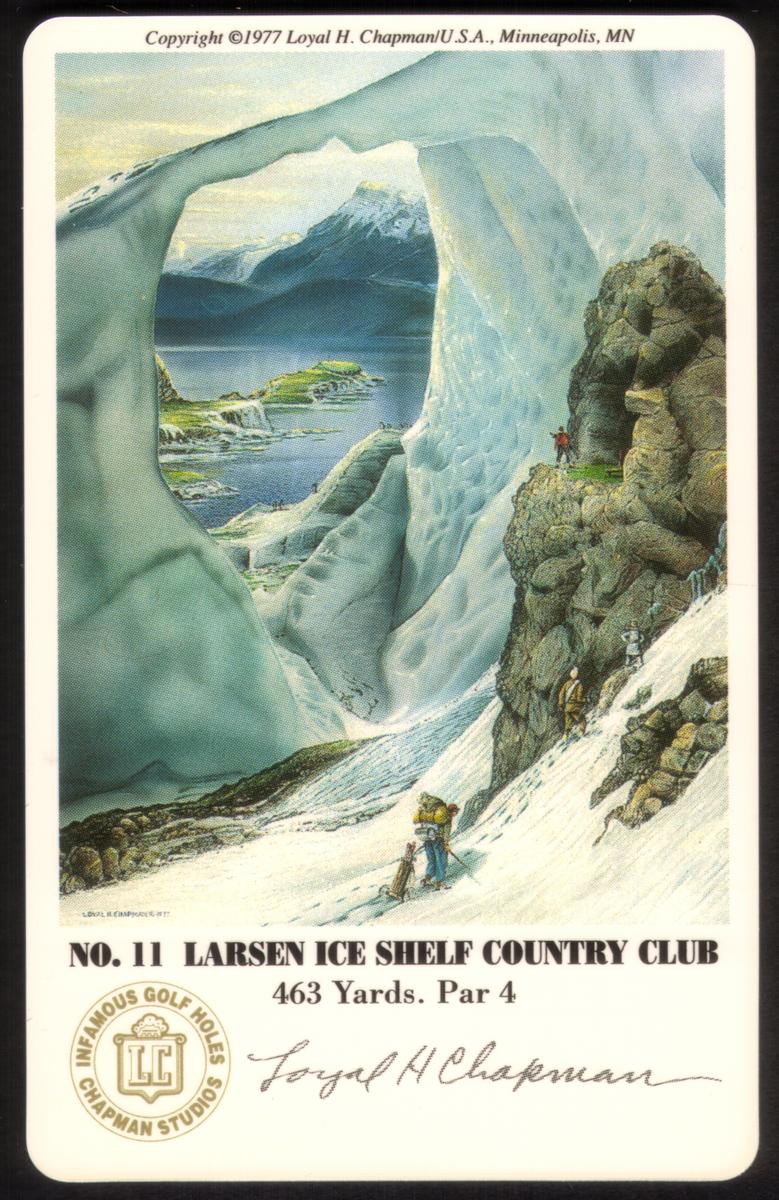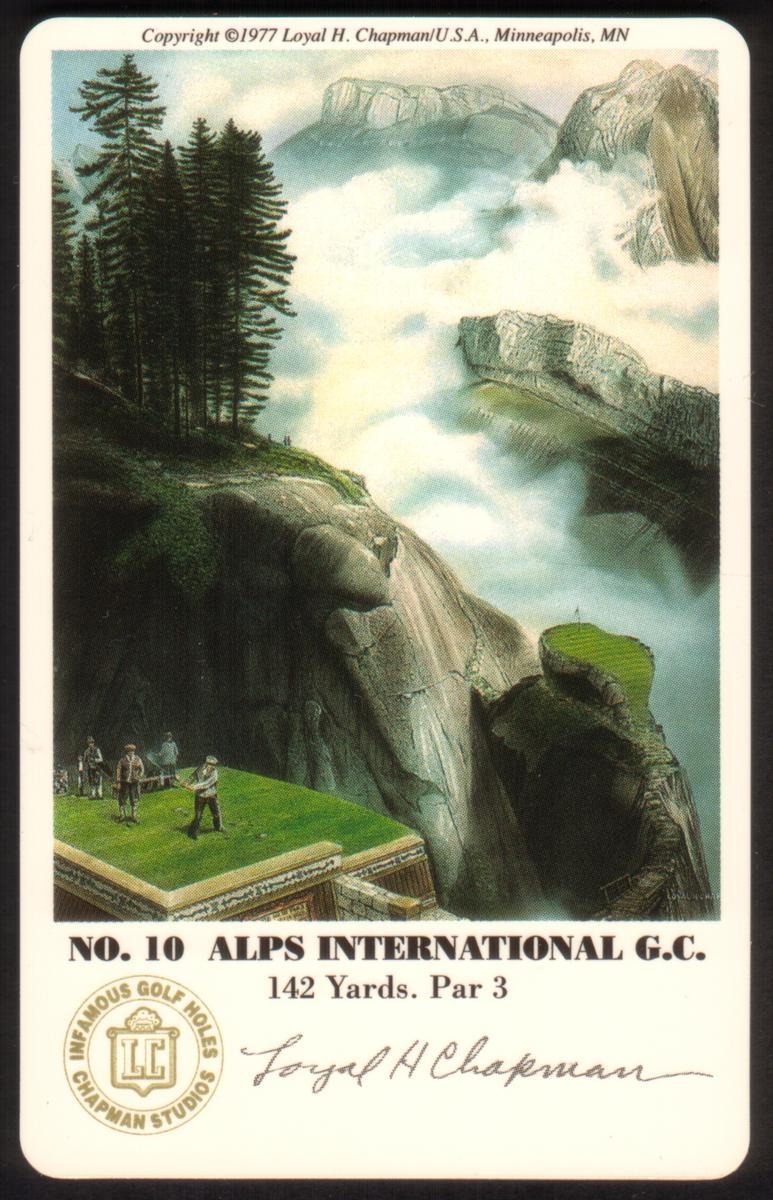 This collection of 18 golf-themed collectible cards features artistic and scenic renderings of fantasy golf holes at well-known and imaginative golf clubs, created by Loyal H. Chapman and copyrighted between 1975 and 1980 in Minneapolis, MN. Each card displays the name of the golf club, hole number, yardage, par information, and Loyal H. Chapman's signature, accompanied by the Chapman Studios emblem labeled "Infamous Golf Holes." The artwork combines natural and dramatic landscapes with detailed golf course elements, portraying golfers actively engaging with the holes.