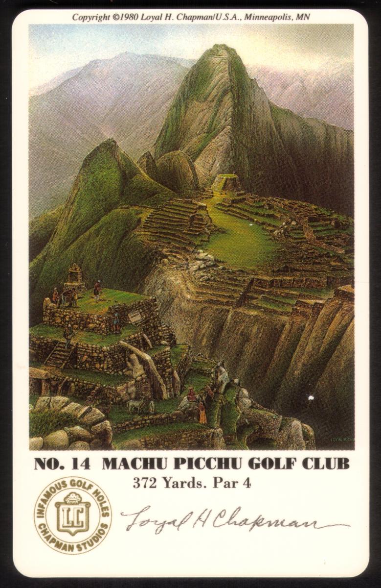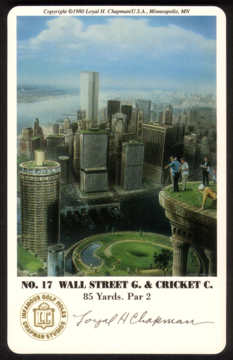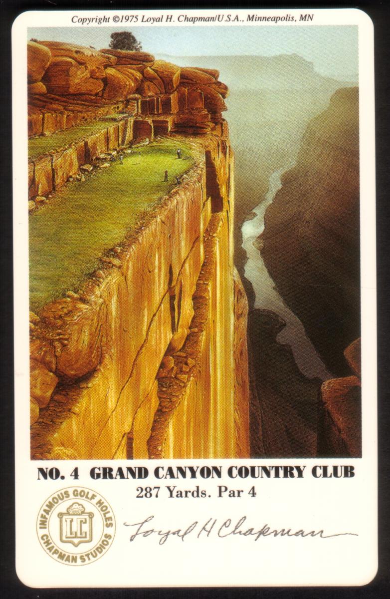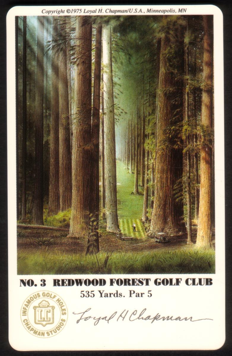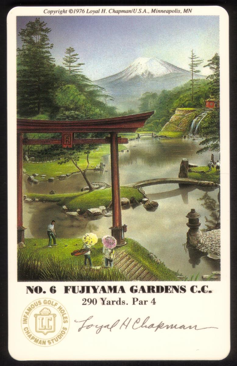 This collection of 18 golf-themed collectible cards features artistic and scenic renderings of fantasy golf holes at well-known and imaginative golf clubs, created by Loyal H. Chapman and copyrighted between 1975 and 1980 in Minneapolis, MN. Each card displays the name of the golf club, hole number, yardage, par information, and Loyal H. Chapman's signature, accompanied by the Chapman Studios emblem labeled "Infamous Golf Holes." The artwork combines natural and dramatic landscapes with detailed golf course elements, portraying golfers actively engaging with the holes.