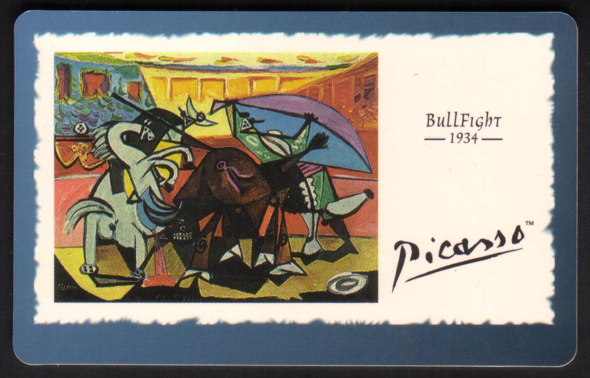 This set of four collectible cards features artwork by Pablo Picasso from 1934, each depicting scenes from bullfighting. Each card has a distinct colored border—blue, brown, green, and rust—and portrays Picasso’s unique artistic style with abstract, cubist representations of bulls, matadors, and horses in action within a bullfight arena.