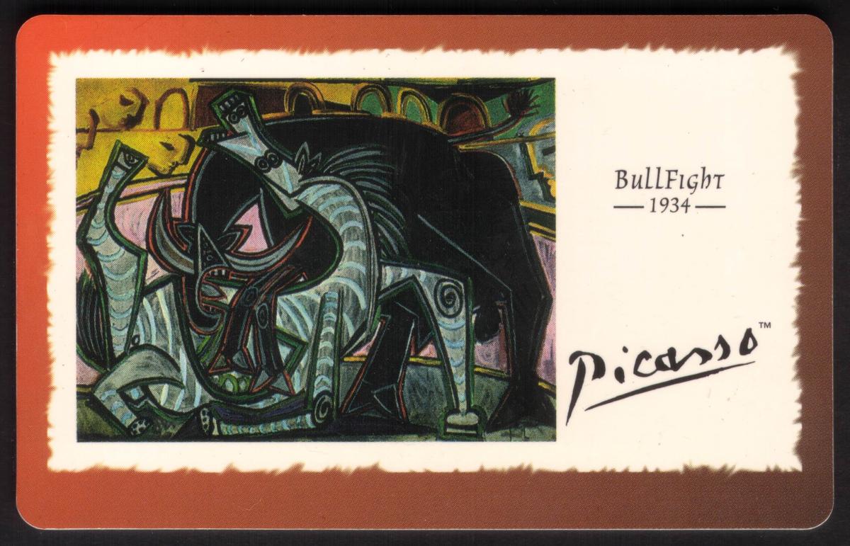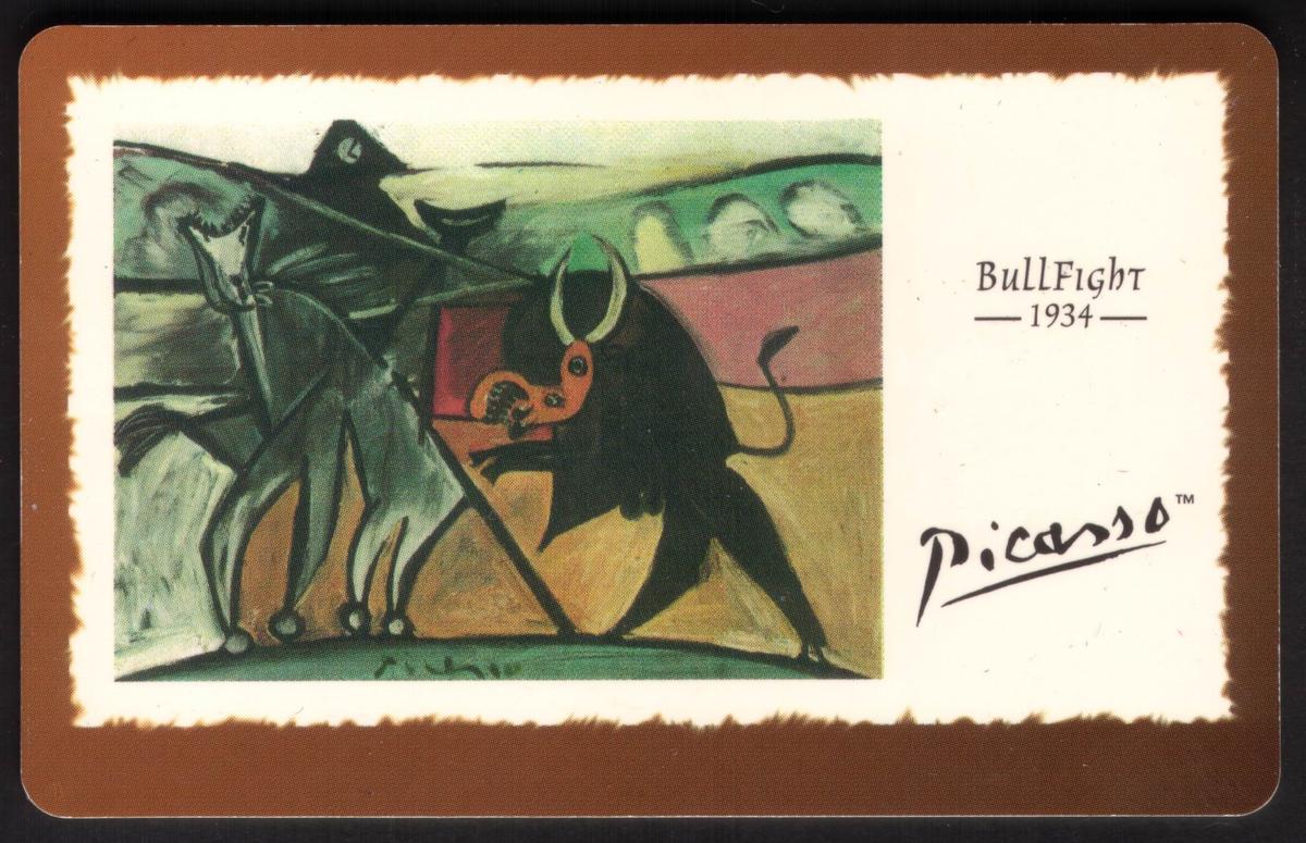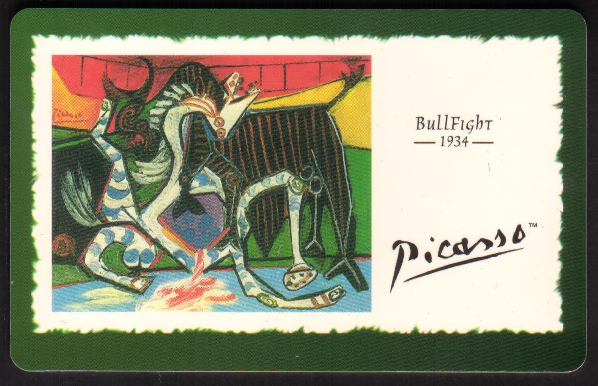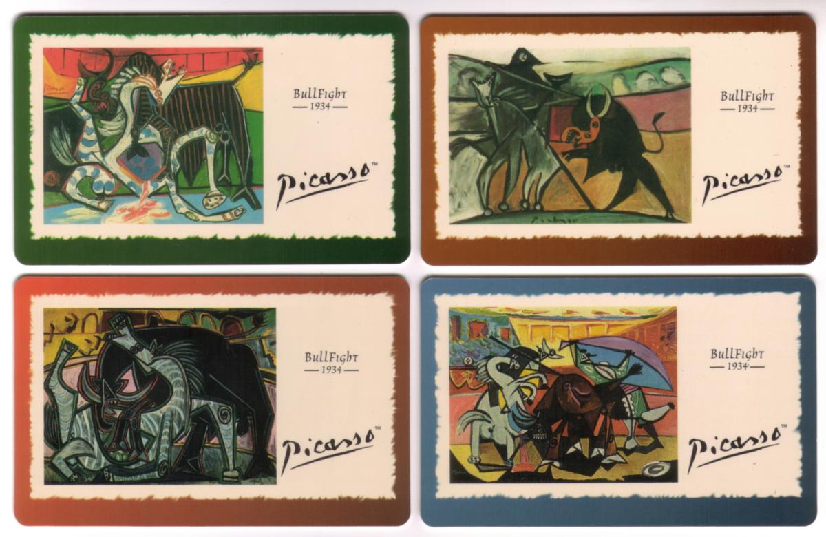 These collectible cards feature artwork by Pablo Picasso titled "Bull Fight 1934," printed as a set of four cards. Each card displays a distinct abstract depiction of a bullfighting scene, rendered in Picasso's signature Cubist style. The cards measure approximately the size of standard collectible phone cards, with a colored border framing the artwork on the left and a white section on the right containing text.
