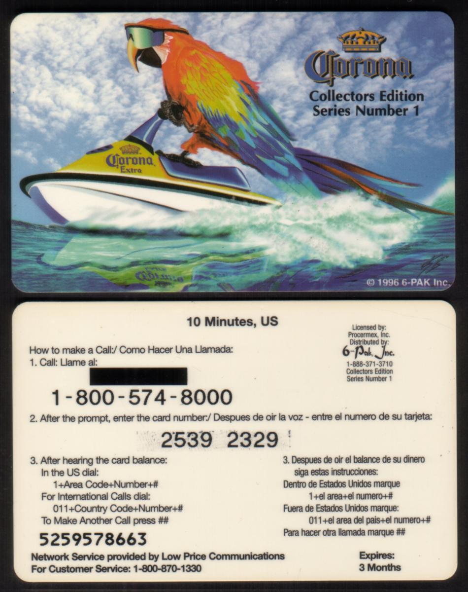 Vibrant tropical parrot on jet ski with Corona logo, bright ocean scene, collectible design, and functional prepaid phone card for US calls. |