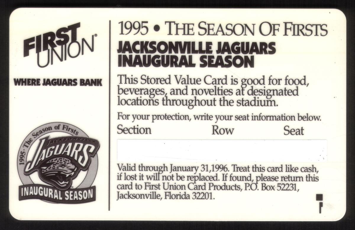 The cards have the official NFL and National Football League logos, affirming their connection to professional American football. The text on the cards includes “Jacksonville Jaguars,” the team’s name, and “First Union Corp. Bank,” indicating the financial institution associated with these stored value cards. Each card has an artistic feline face design set against backgrounds that complement the jaguar theme.