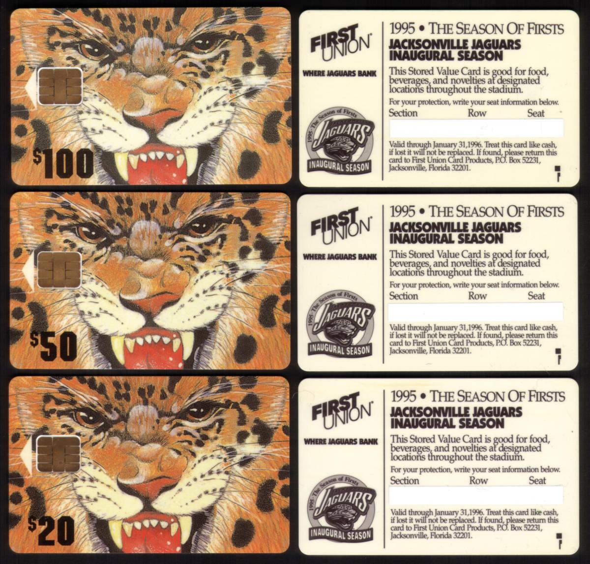 These collectible bank cards connect Jacksonville, Florida, to the sport of football and its NFL franchise, the Jacksonville Jaguars. The use of stored value chip card technology identifies them as usable bankcards rather than phone cards or other collectible types. This set of three cards appeals to collectors interested in sports, NFL memorabilia, and unique stored value bank cards with distinctive animal imagery.
