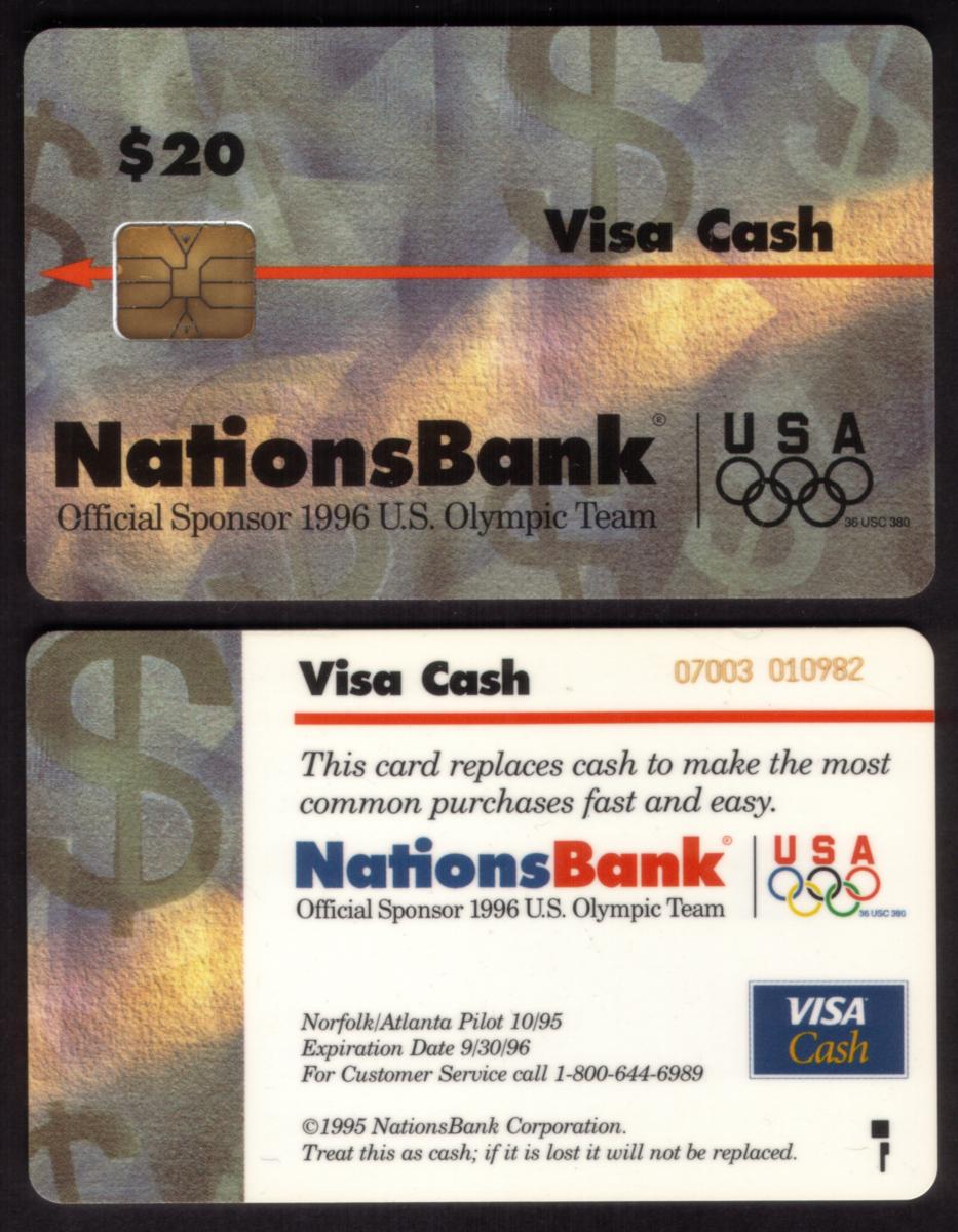 This NationsBank Visa Cash Card was issued for the Norfolk & Atlanta Pilot Trial associated with the 1996 Olympics, making it a collectible item linked to that historic event.