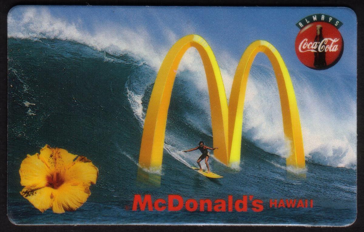 This card combines themes of surfing, Hawaiian flora, and well-known global brands McDonald's and Coca-Cola, highlighting their association with Hawaiian watersports and culture.