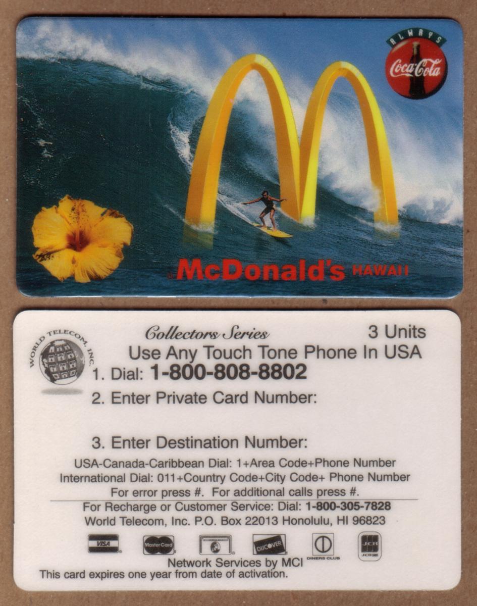 Hawaiian-themed phone cards featuring surfing, McDonald''s arches as waves, Coca-Cola branding, hibiscus flowers, and clear instructions for calling and recharging. |