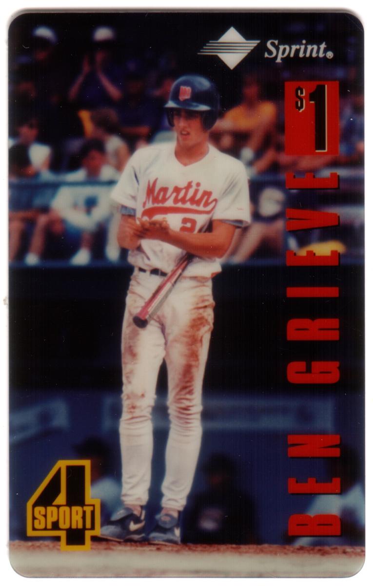 This collectible phone card features an image of Ben Grieve, a Major League Baseball player. Ben Grieve is shown in a dynamic baseball action pose, wearing a baseball uniform and holding a bat, positioned as though ready to swing. The artwork emphasizes key elements related to baseball, including a prominently displayed baseball and a baseball bat in the foreground, reinforcing the sports theme.