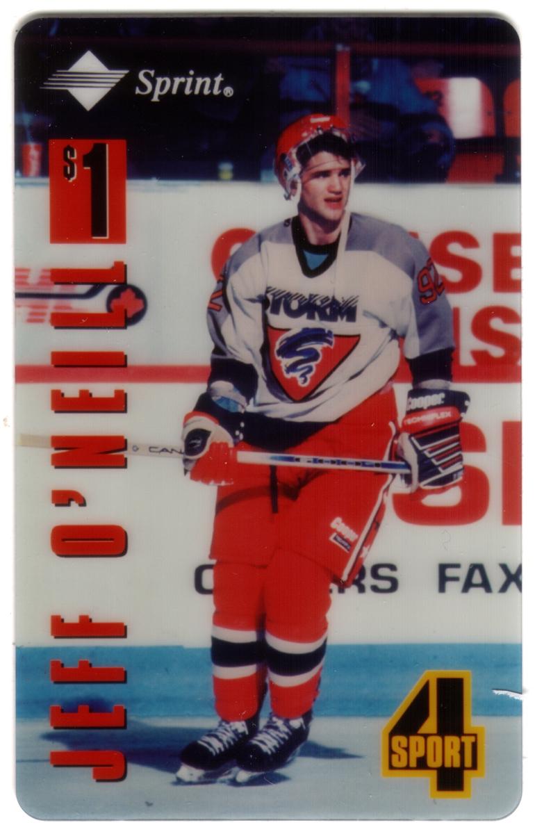 This card has a monetary value printed as "$1" and measures typical card dimensions. The overall design emphasizes Jeff O'Neill’s role as a hockey player and highlights his professional affiliation during the era when the Hartford Whalers were active in the NHL.