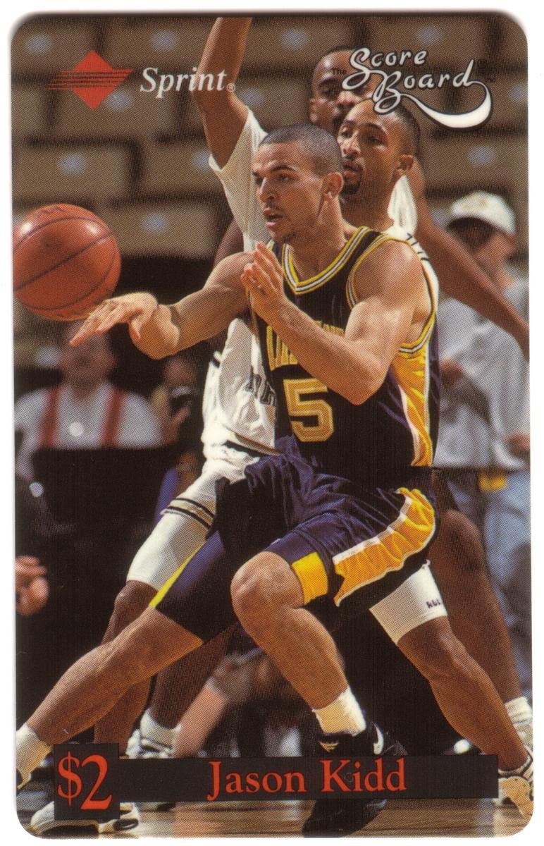2. Jason Kidd in a navy blue and yellow West Virginia University uniform with the number 5, dribbling the ball during play. Two defenders are visible in the background, and Kidd's concentration is highlighted in the image.