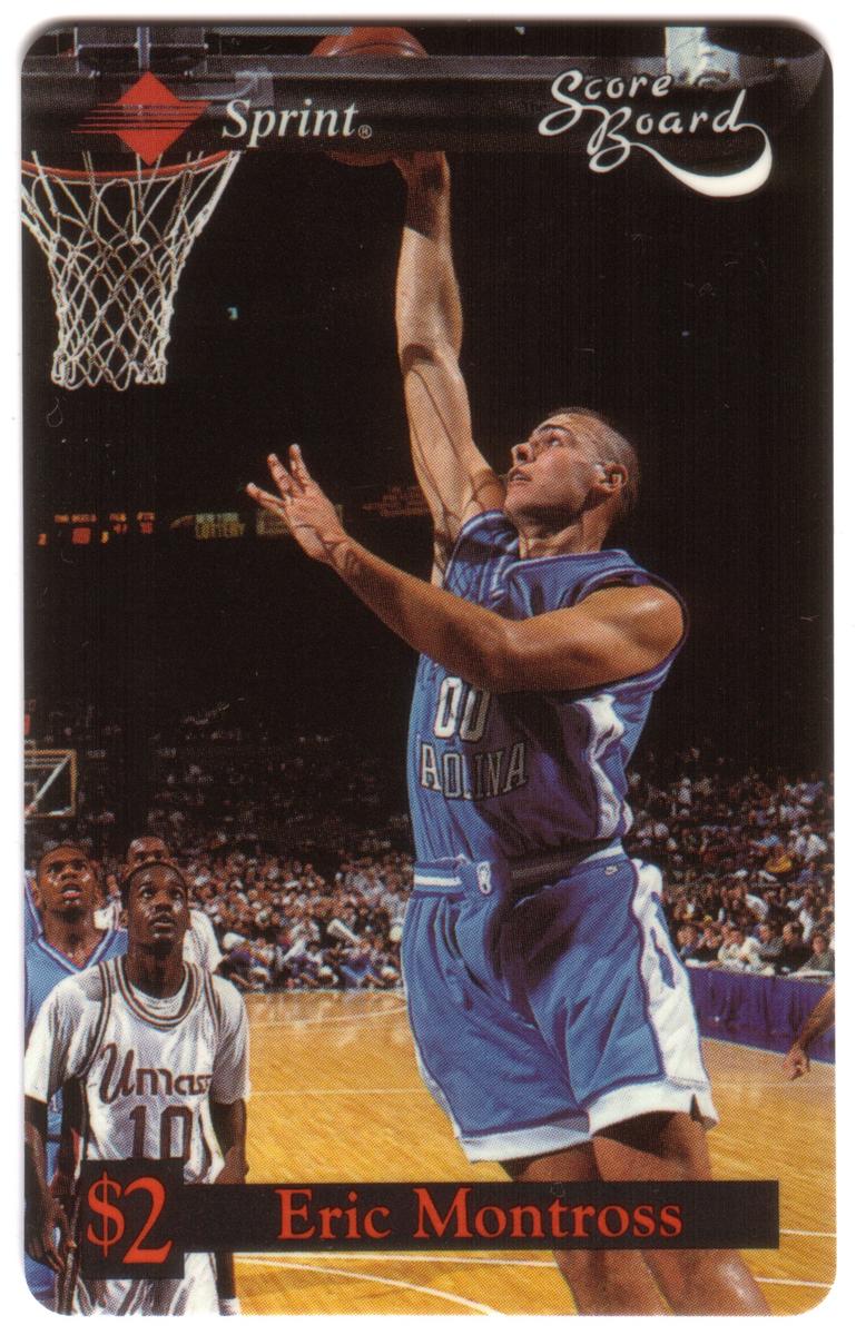 4. Eric Montross in a light blue University of North Carolina jersey with the number 8, reaching up toward the hoop for a shot or rebound. The opposing team’s players wear white uniforms, and the crowd is visible behind him.