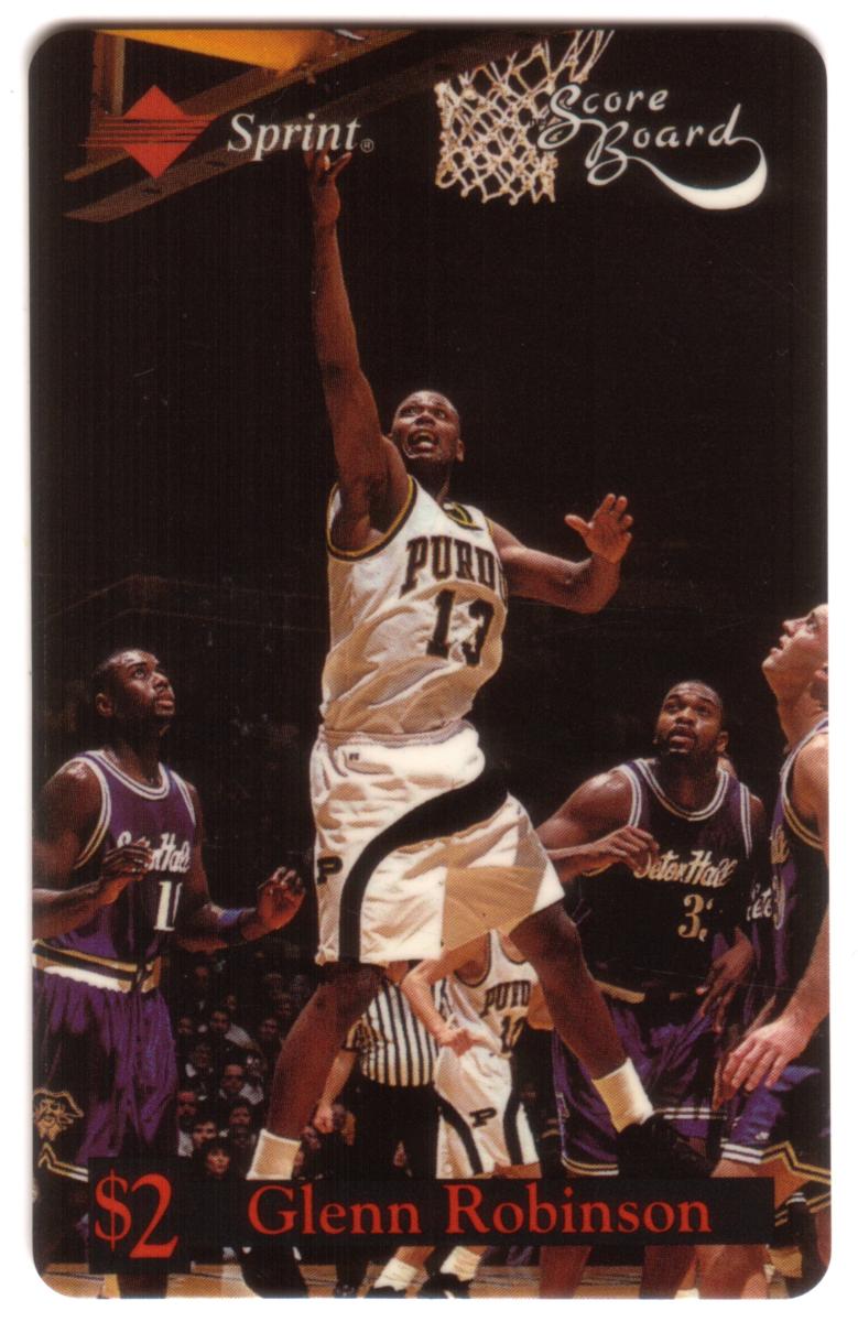 5. Glenn Robinson wearing a white Purdue University uniform with the number 13, executing a driving move at the basket surrounded by defenders from a team in dark purple and white uniforms.