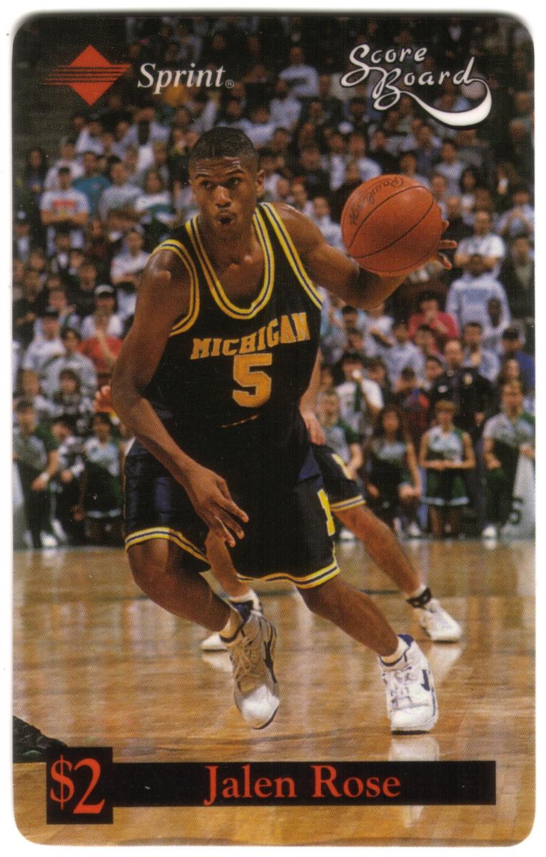 6. Jalen Rose in a black University of Michigan jersey with the number 5, dribbling the basketball during game action on a hardwood court. The background shows spectators and players in white uniforms.