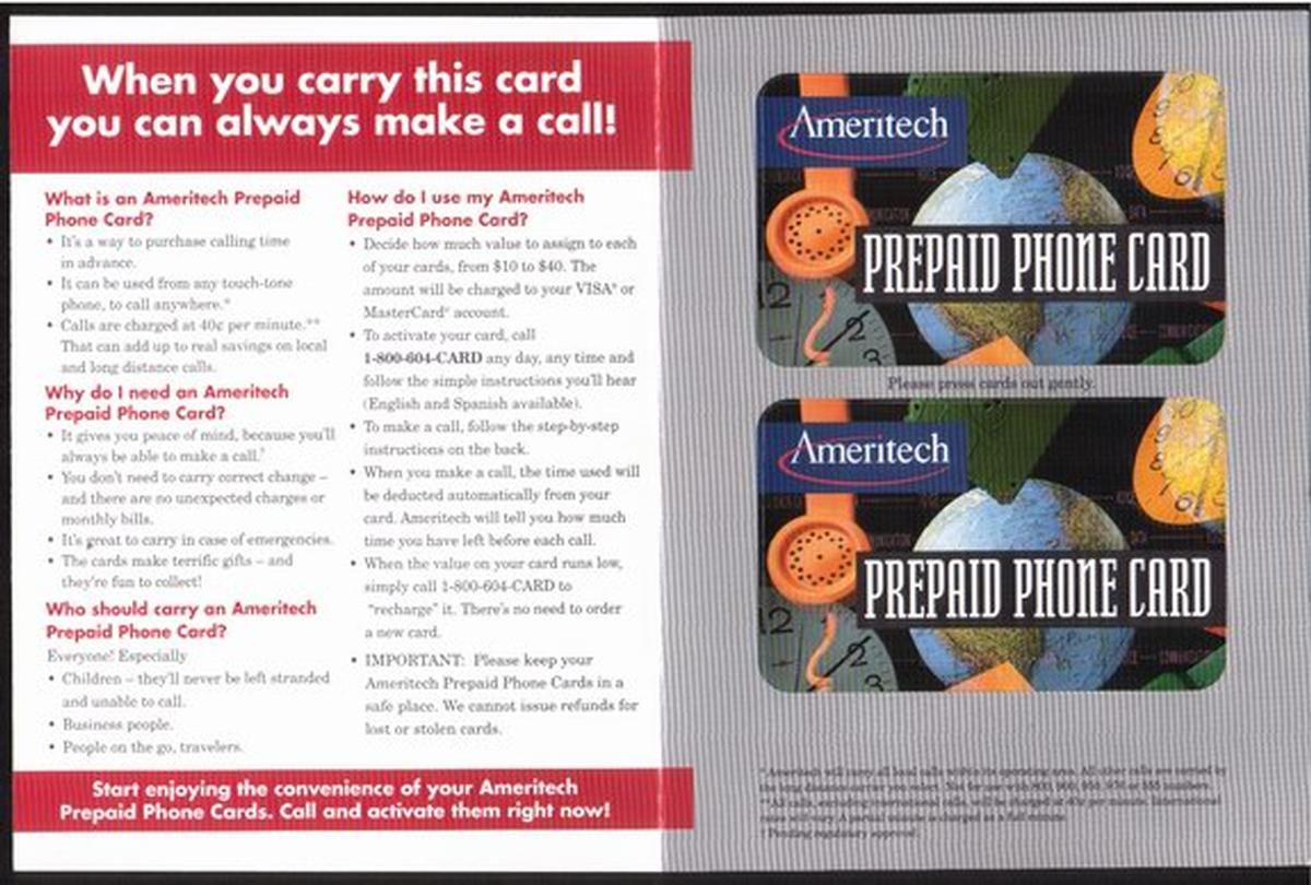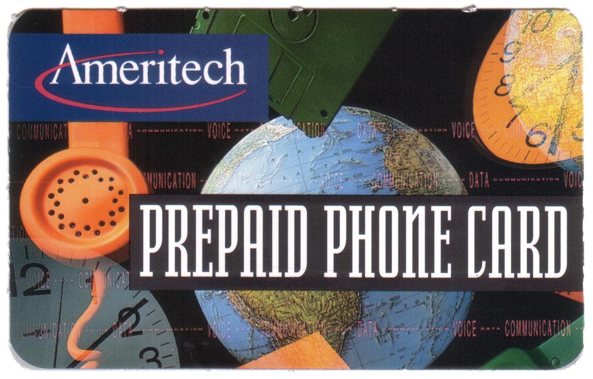 Across the center of the card, the bold white text "PREPAID PHONE CARD" is prominently displayed, clearly indicating the card's use. The overall design integrates these elements to emphasize themes of time, communication, and global reach, aligned with Ameritech's telecommunications services.