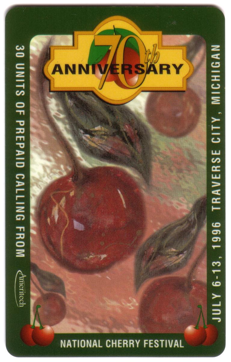 This collectible phone card commemorates the 70th Anniversary of the National Cherry Festival held in Traverse City, Michigan, in July 1996. The card prominently displays a close-up image of cherries, highlighting the fruit’s vibrant red color and natural texture. The cherries are arranged closely together, showcasing their freshness and appeal.