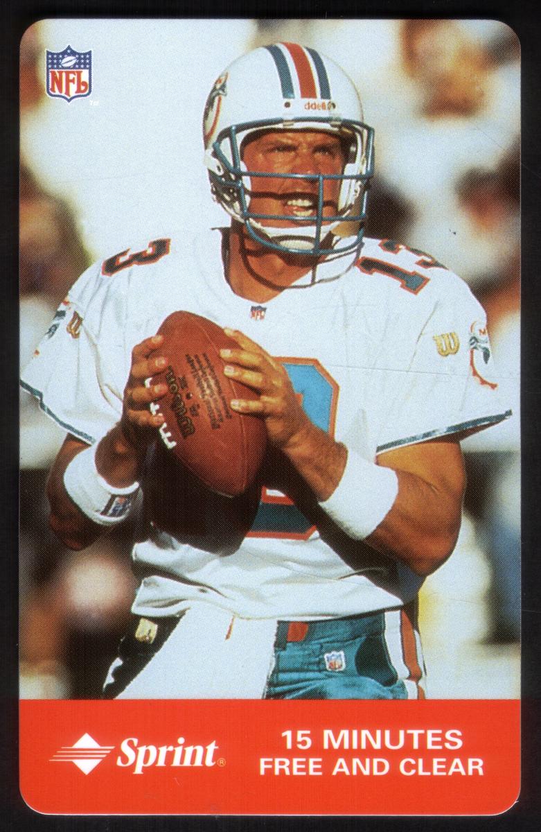 The third card showcases a San Francisco 49ers player in a red jersey with white numbers and a gold helmet including the 49ers emblem. He is captured winding up for a throw. The final card presents a Miami Dolphins quarterback wearing a white jersey with aqua and orange accents and a white helmet adorned with the Dolphins logo, holding the football in a ready position. Each card prominently displays the NFL shield logo in the upper right corner, along with Sprint branding and the text "15 MINUTES FREE AND CLEAR" at the bottom, emphasizing their function as phone cards offering talk time. This set of four cards highlights celebrated heroes of the National Football League.