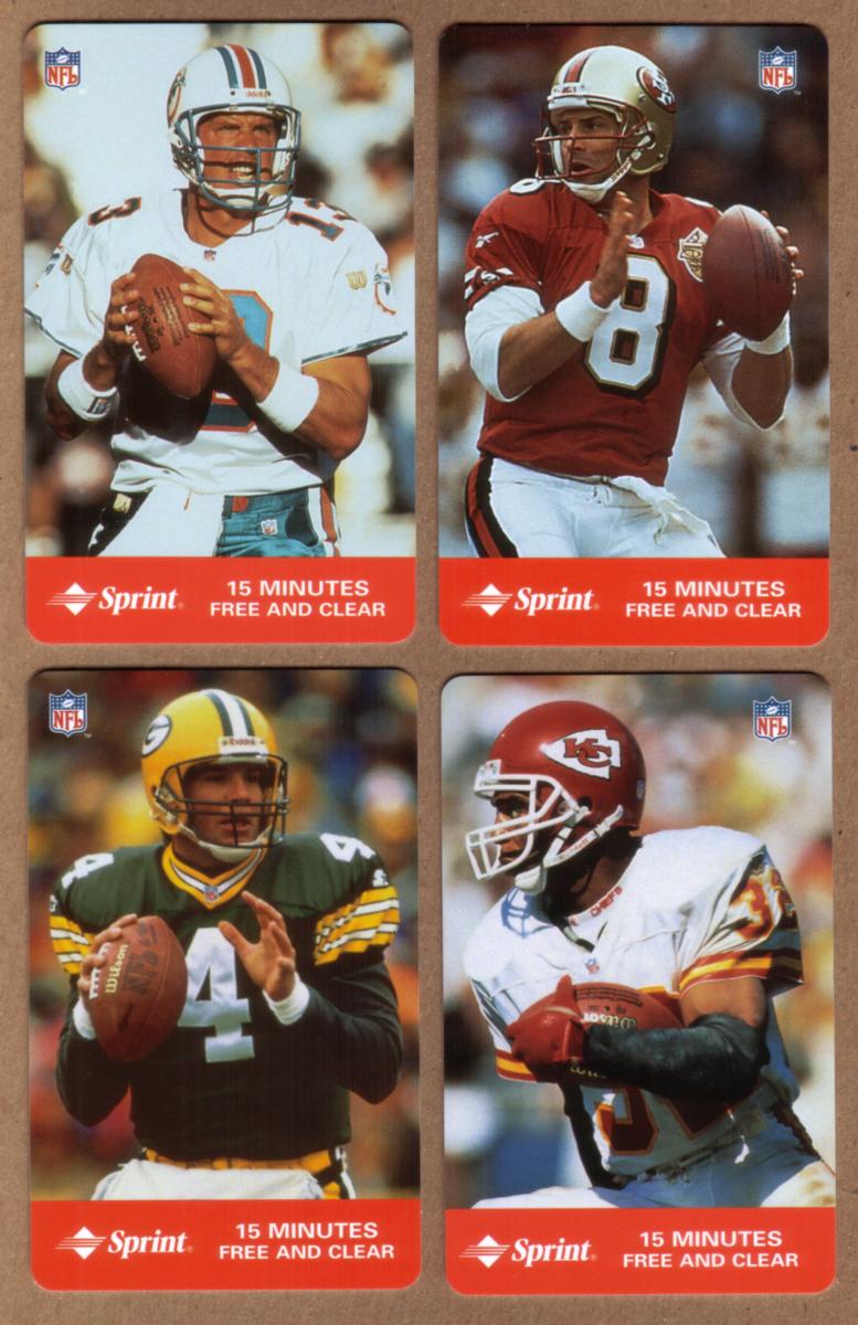 These collectible NFL phone cards from Sprint depict four iconic football legends in mid-action, each holding a football and dressed in their respective team uniforms. The first card features a Kansas City Chiefs player wearing a red helmet with the Chiefs logo and a white jersey with red and yellow trim, gripping a football firmly as he prepares for a play. The second card shows a Green Bay Packers quarterback, identifiable by the green jersey with yellow and white striping and a yellow helmet with the Packers logo, poised to throw the football.