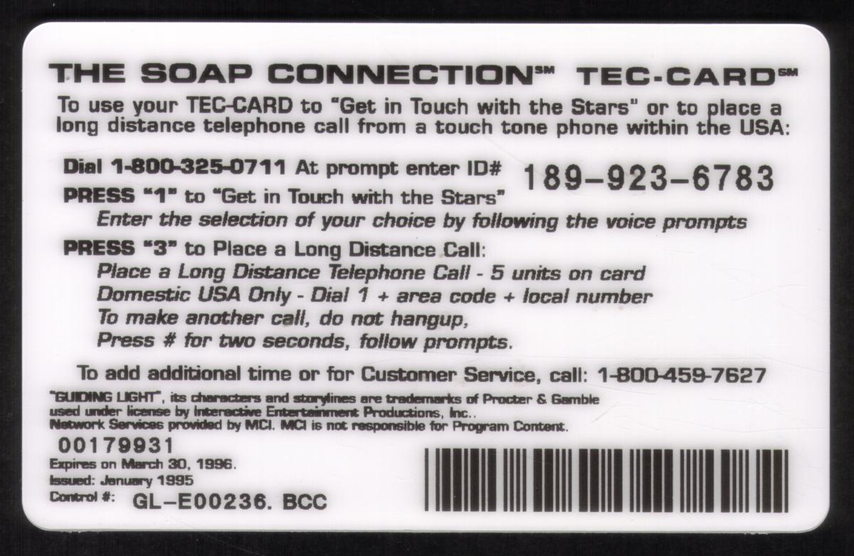 This card is an entertainment-themed collectible phone card, representing a specific actor and romantic drama genre from daytime TV soaps. It captures a formal portrait style suitable for fans of Guiding Light and those interested in daytime television character actors.