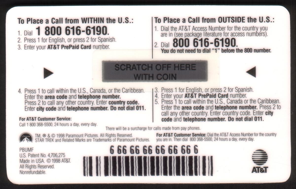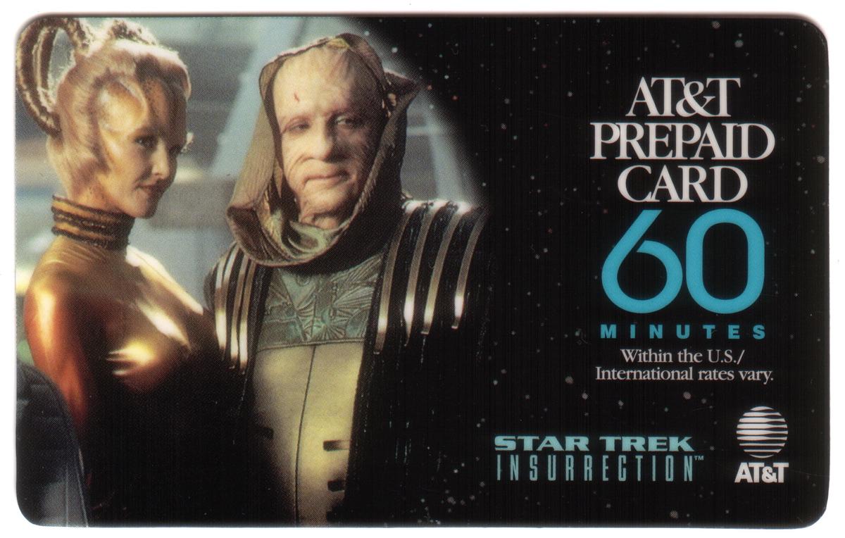 These four AT&T prepaid cards feature scenes from the 1998 Paramount Pictures film, Star Trek: Insurrection. Each card displays a distinct image of characters from the movie alongside the prepaid calling time available on the card.