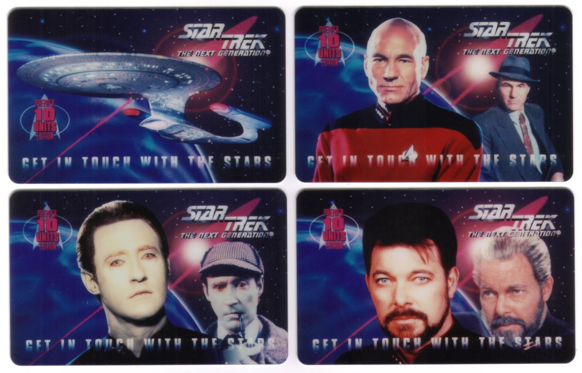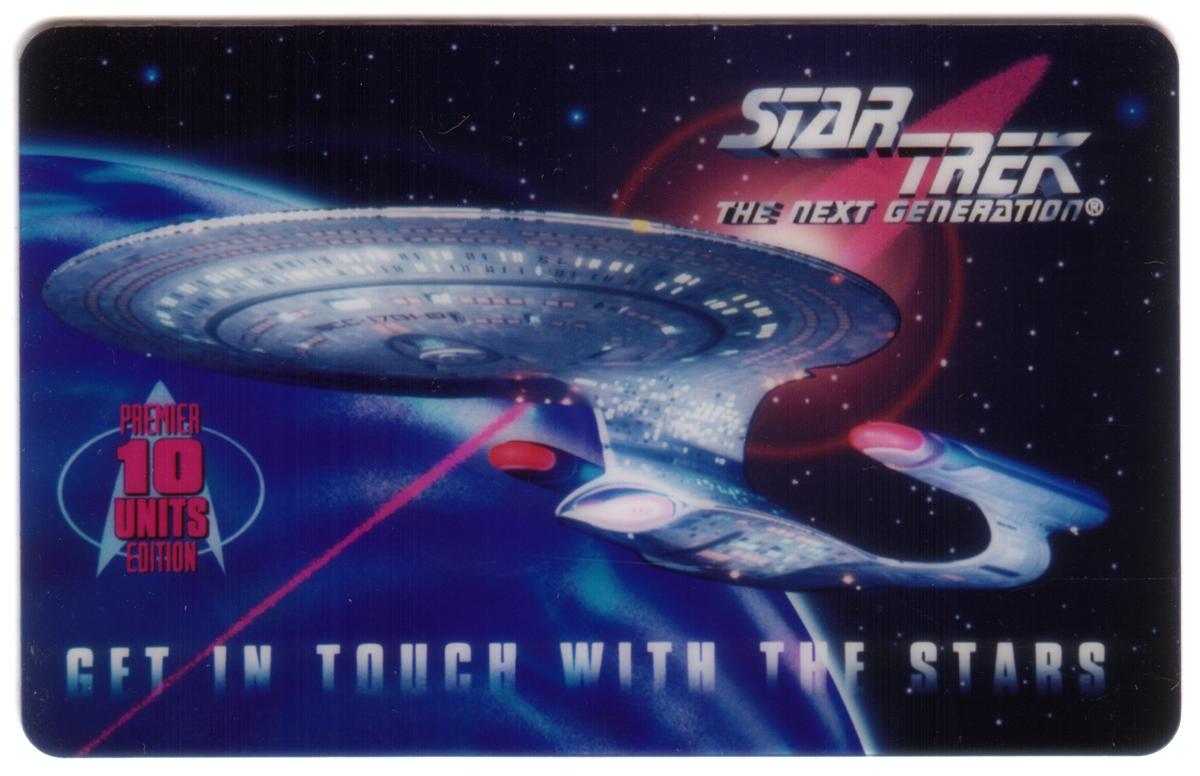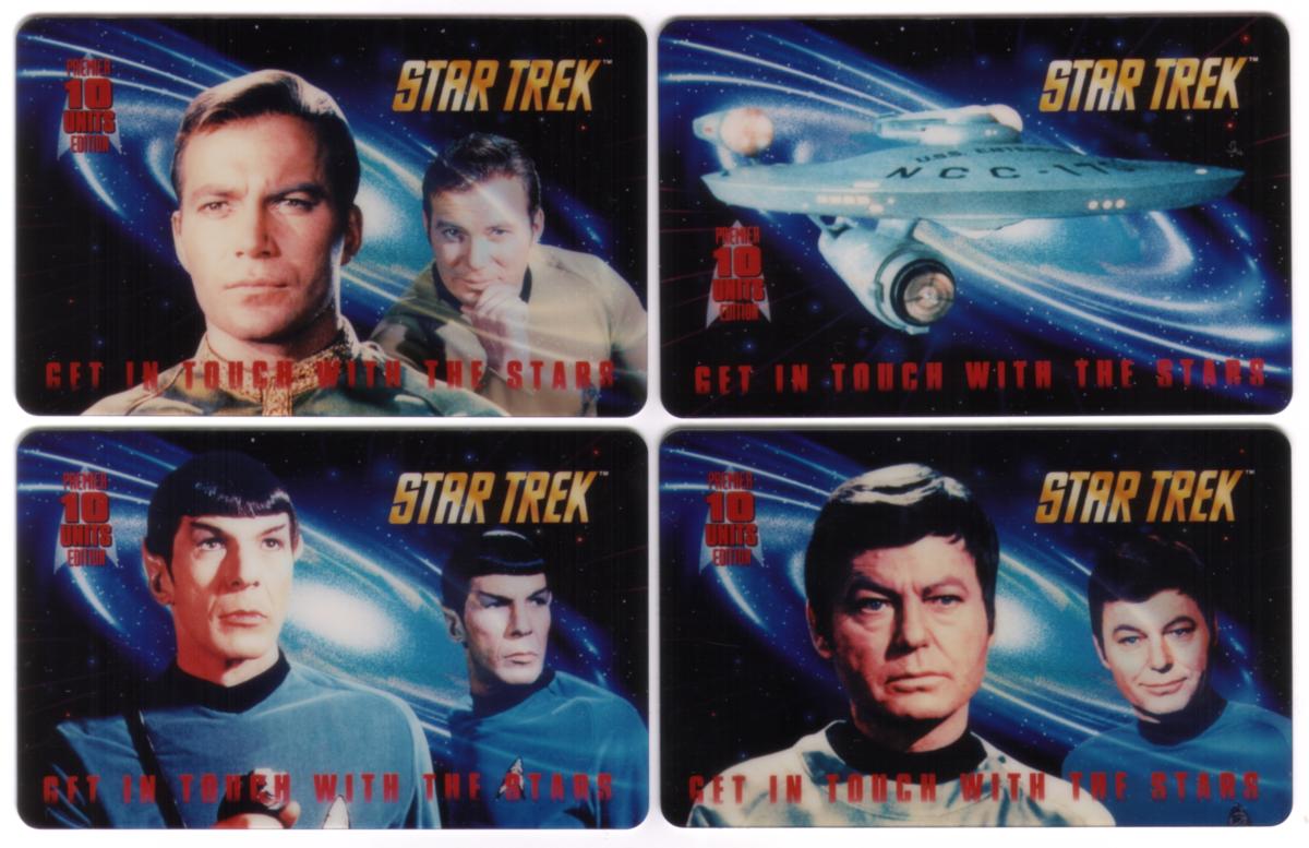 This set of collectible phone cards features imagery from the Star Trek franchise, including Star Trek: The Original Series, Star Trek: The Next Generation, and Star Trek: Voyager. Each card has a space-themed background with versions of the phrase "GET IN TOUCH WITH THE STARS" printed in red or white text at the bottom. The cards are marked as a "PREMIER 10 UNITS EDITION."