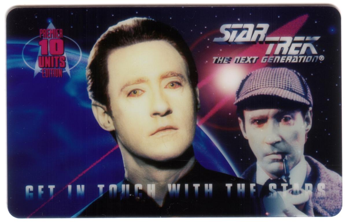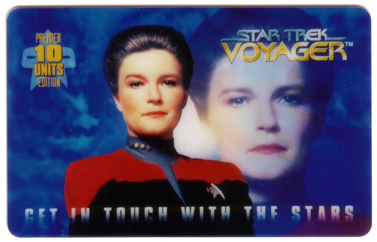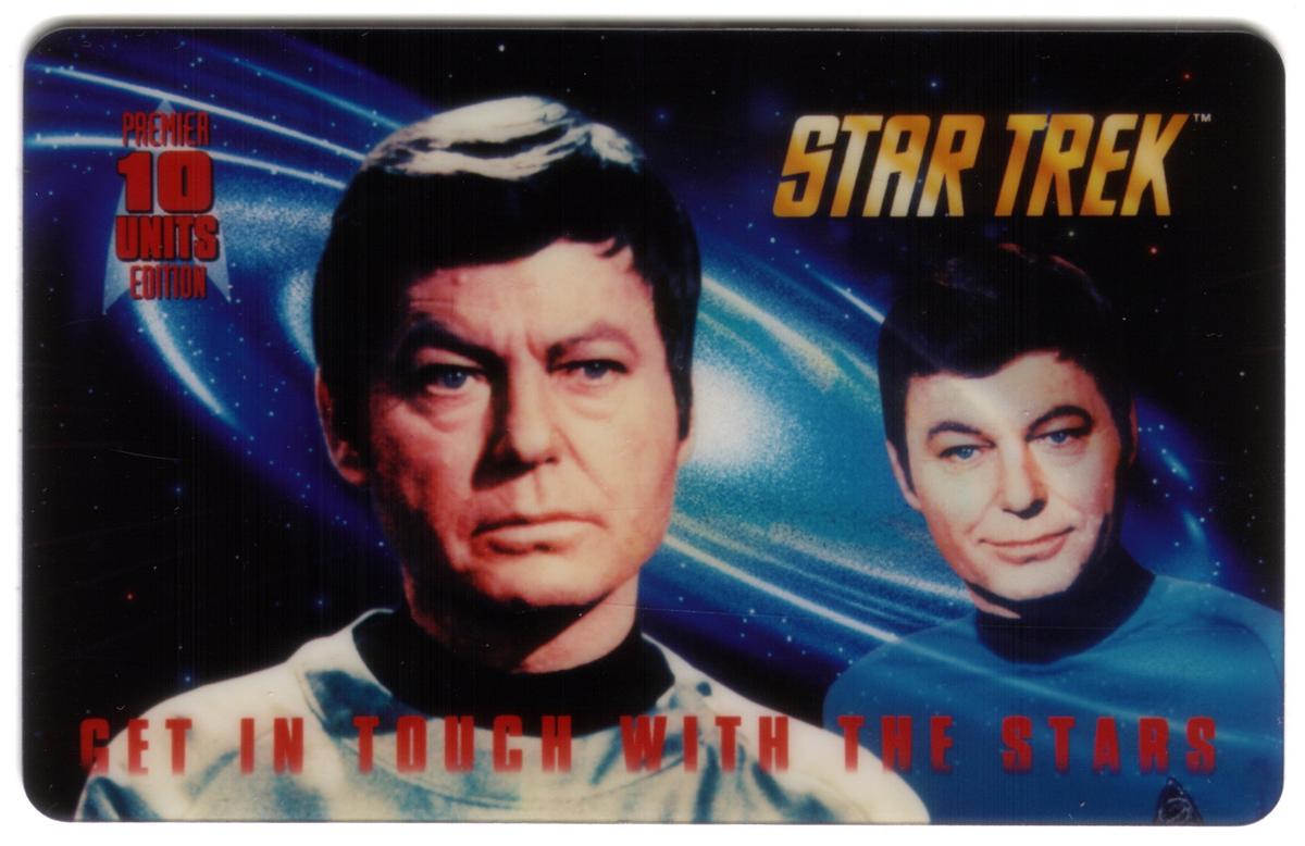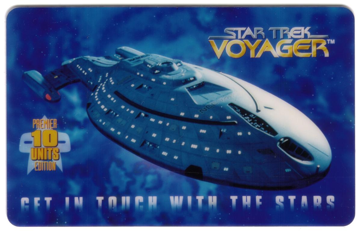 This set of collectible phone cards features imagery from the Star Trek franchise, including Star Trek: The Original Series, Star Trek: The Next Generation, and Star Trek: Voyager. Each card has a space-themed background with versions of the phrase "GET IN TOUCH WITH THE STARS" printed in red or white text at the bottom. The cards are marked as a "PREMIER 10 UNITS EDITION."
