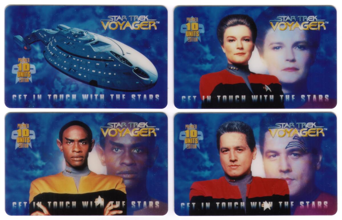 The Star Trek: Voyager cards depict the USS Voyager starship on one card. Additional cards show Captain Kathryn Janeway (Kate Mulgrew), Commander Tuvok (Tim Russ), and Commander Chakotay (Robert Beltran), each with a secondary faded portrait of the same character in the background. The "STAR TREK VOYAGER" logo appears in yellow at the upper right of each card. Each card communicates the theme of space exploration and iconic characters from the respective Star Trek series through detailed photographic portraits and starship imagery.