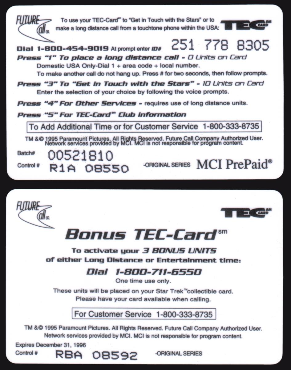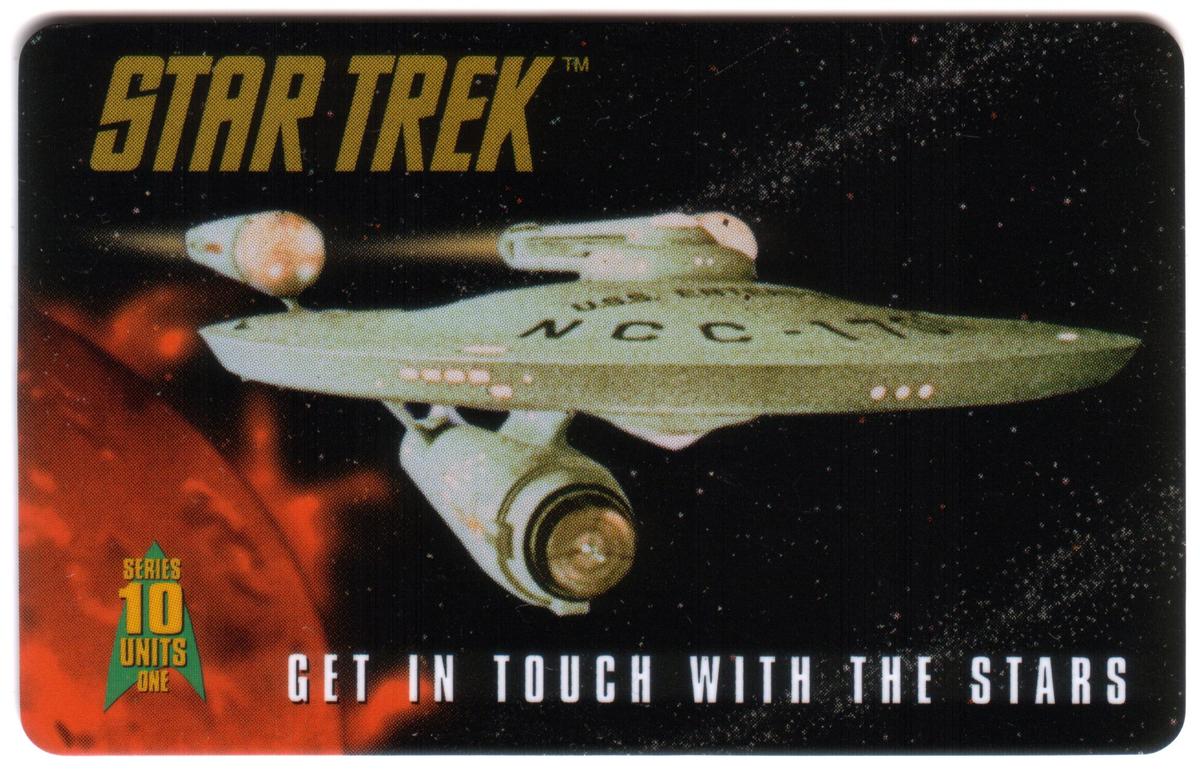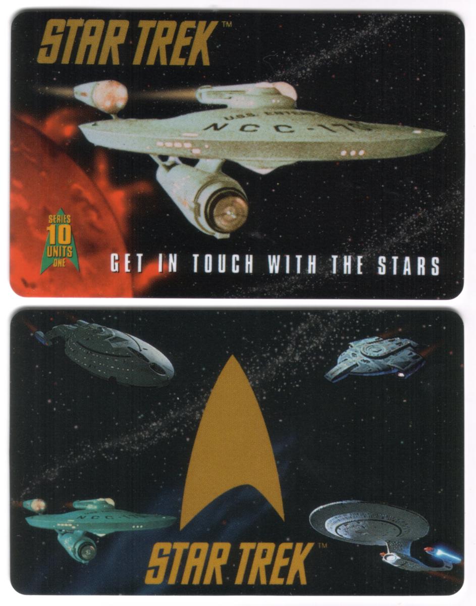Star Trek-themed prepaid calling cards featuring USS Enterprise space imagery, Starfleet emblem, and instructions, blending 1990s telecom with sci-fi fandom. |