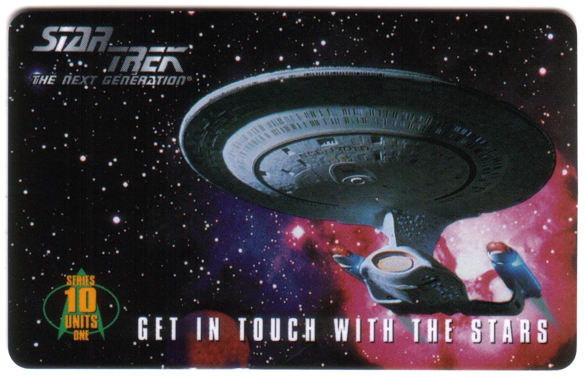 Both cards are issued by Future Call Company, a producer of collectible phone cards, and emphasize themes of Hollywood entertainment, fantasy art, and outer space adventure. The set highlights the legacy of Star Trek: The Next Generation through its use of iconic spacecraft imagery and recognizable insignia, designed for collectors and fans of television science fiction.