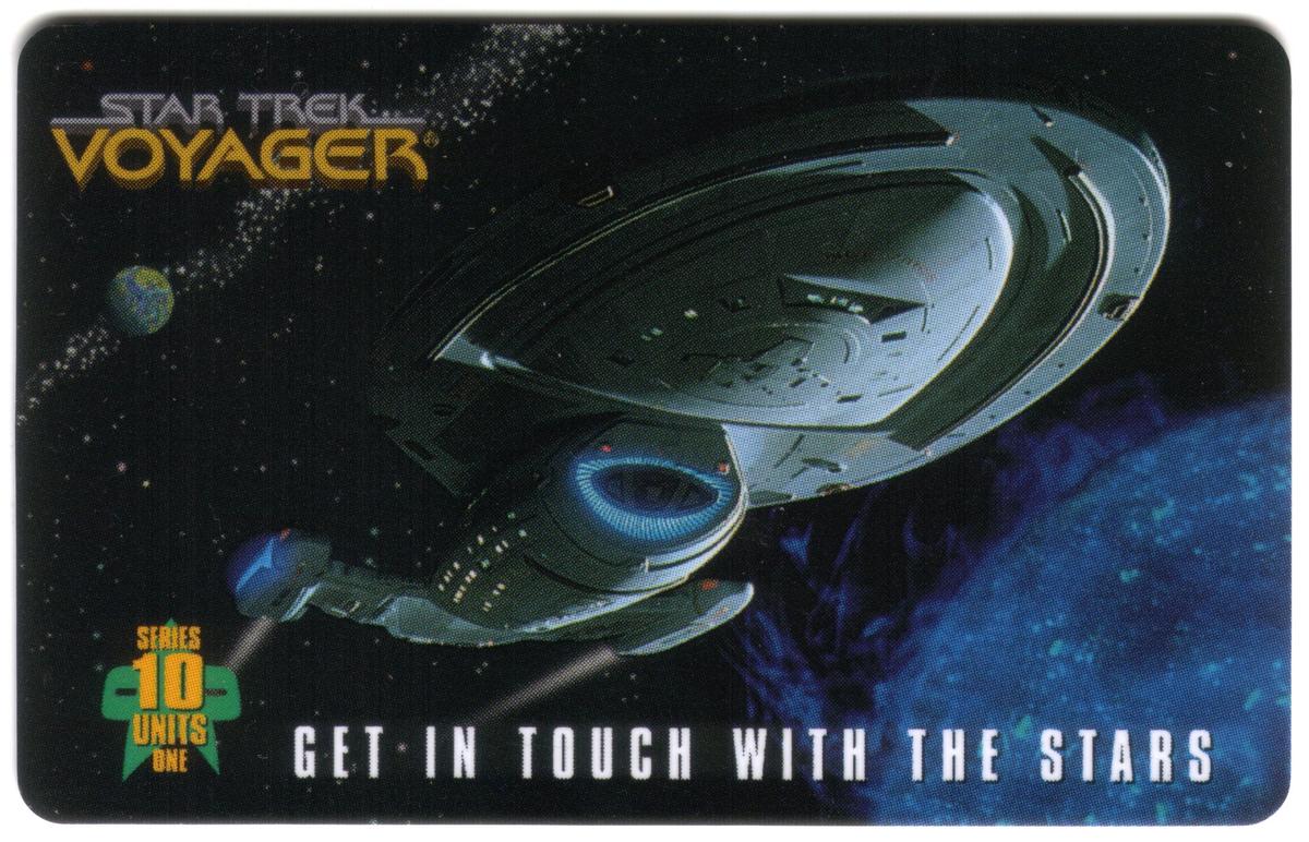 The second card in the set highlights imagery connected to the *Star Trek: Voyager* television series, reflecting the outer space and sci-fi genre. It incorporates the *Star Trek: Voyager* emblem as well, and together the two cards form a cohesive retail collectible. Both cards are issued by the Future Call Company and are part of a retail offering that includes a bonus emblem card, enhancing the overall collectible value for fans of the series.
