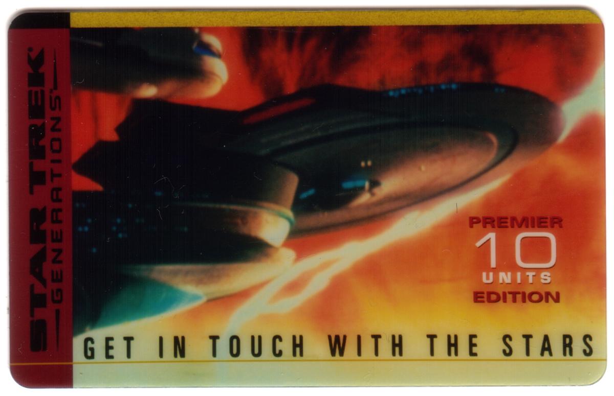 The card includes the title "Star Trek: Generations" printed clearly along with the mention of "10u Enterprise In The Nexus Premier Edition." The design incorporates artistic elements that frame the starship, highlighting its sleek lines and iconic saucer section. The card references Future Call Company, indicating the issuing or production company related to this collectible. Additionally, the card connects to Hollywood and science fiction entertainment, celebrating the art and fantasy of the *Star Trek* franchise.