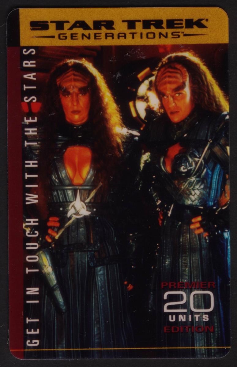 This collectible phone card features characters Lursa and B’etor from the Star Trek Generations film. Both characters are prominently depicted with intricate detail, dressed in their distinctive Klingon attire, reflecting their roles as members of the Klingon House of Duras. The card is part of the 20u Lursa & B’etor Premier Edition issued by Future Call Company, explicitly tied to the Star Trek Generations movie and the science fiction genre.