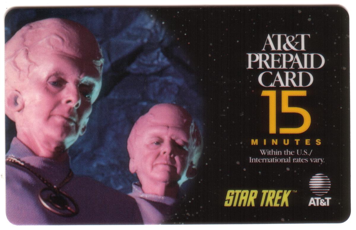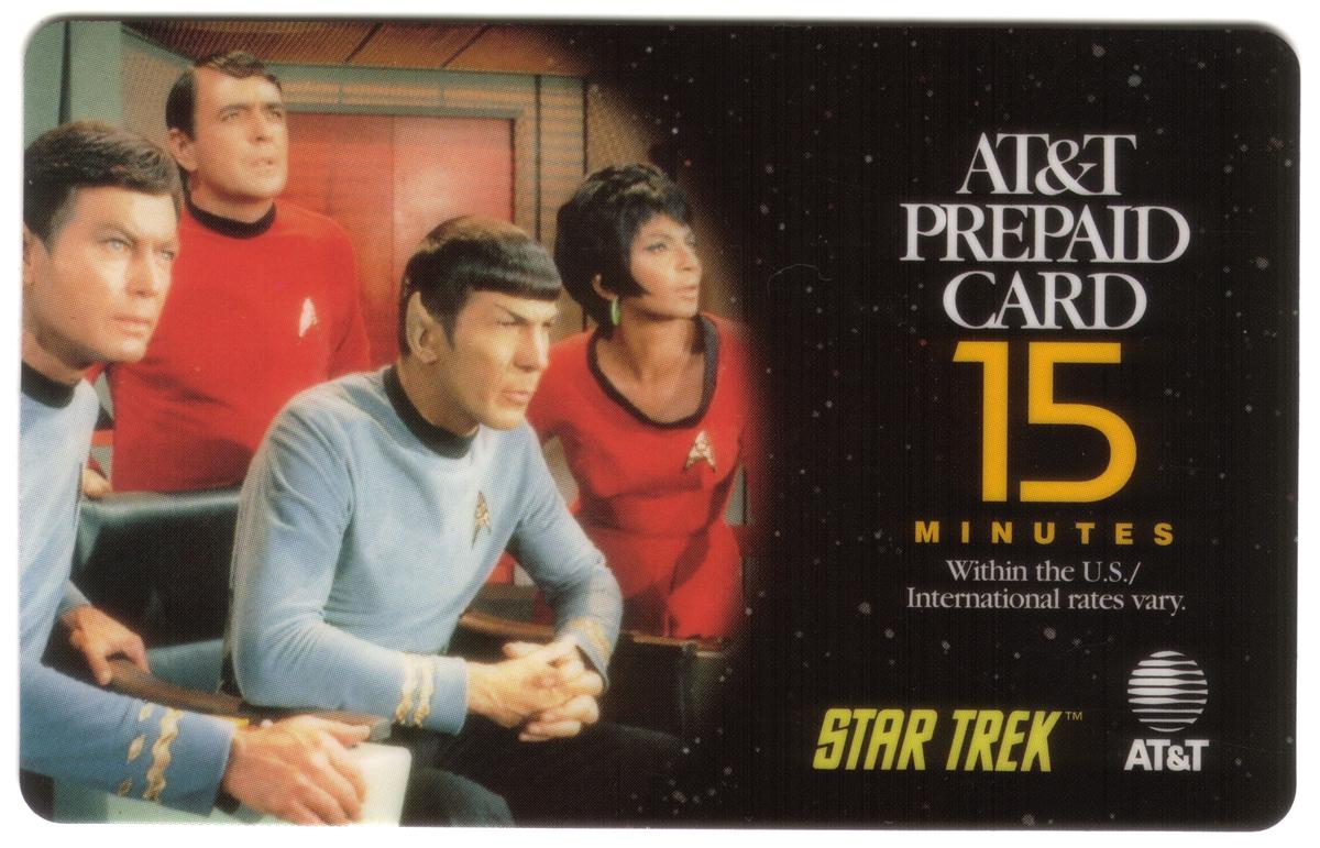 This set of five AT&T prepaid cards features scenes from the original Star Trek television series. Each card offers 15 minutes of call time, valid within the U.S., with international rates indicated as variable. The cards display the AT&T logo and branding alongside the Star Trek trademark.