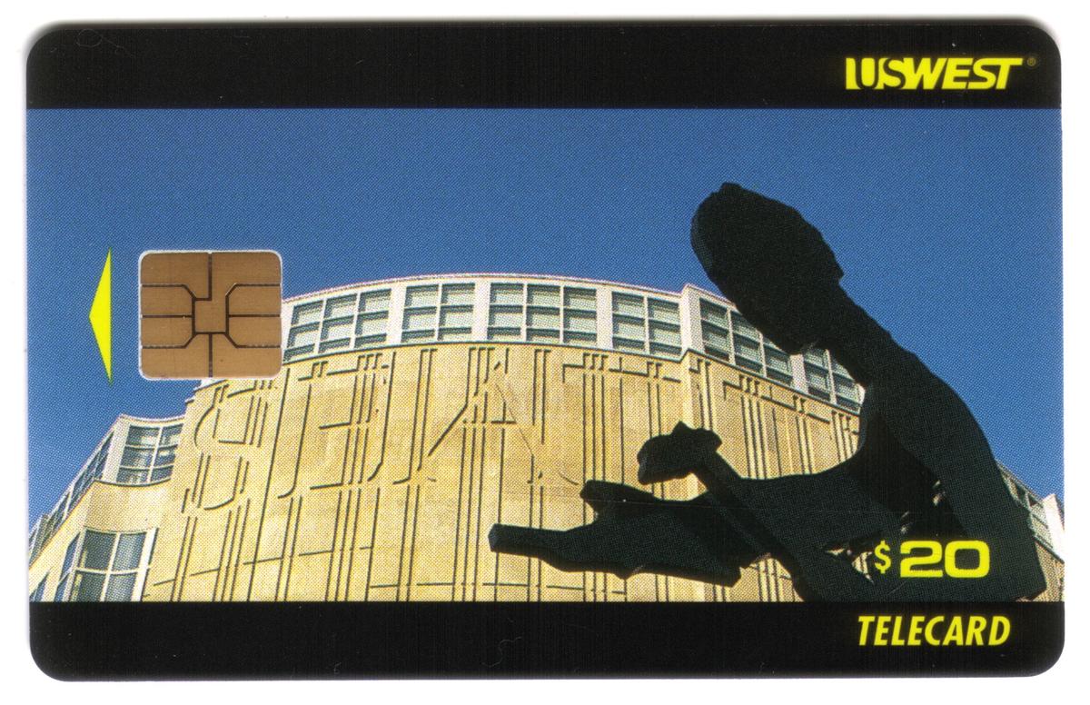 The card includes clear printed text indicating “$20” as the value and features the designation “U.S. West,” reflecting its association with U.S. West Communications. The layout includes the Seattle Art Museum reference and the number “#4:3/3,” which appears to identify this card as part of a series or set. The overall style of the card is artistic and modern, consistent with the sculpture’s design and the museum’s cultural significance.