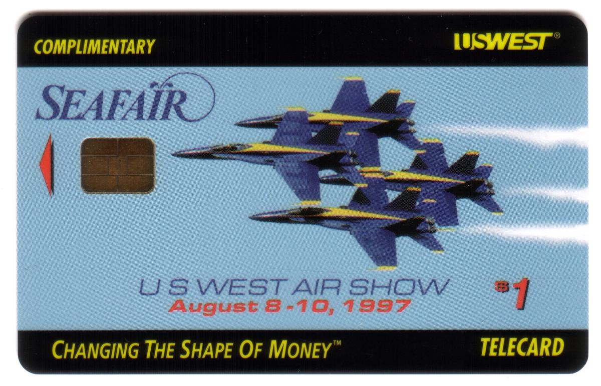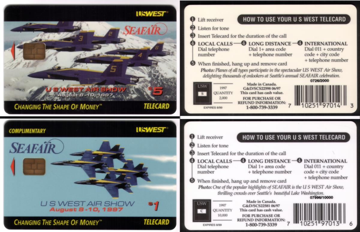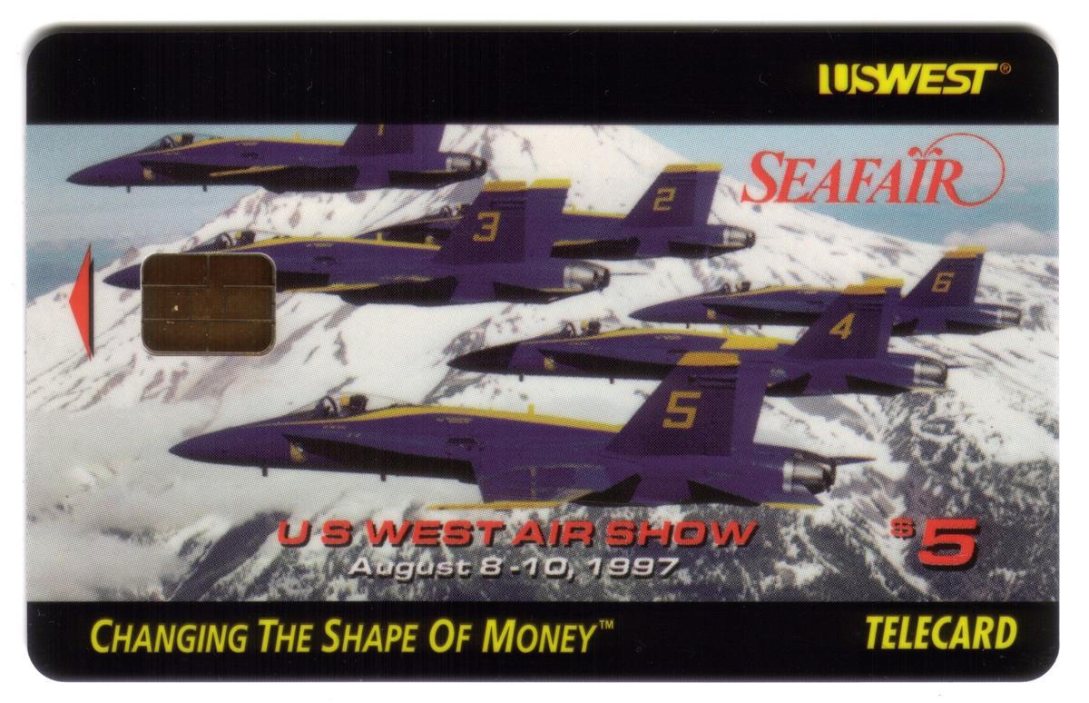 These collectible telephone cards commemorate the U.S. West Air Show held during Seattle SeaFair, from August 8 to 10, 1997. Each card features the Blue Angels, the United States Navy's flight demonstration squadron, showcasing their precision flying in military jets.