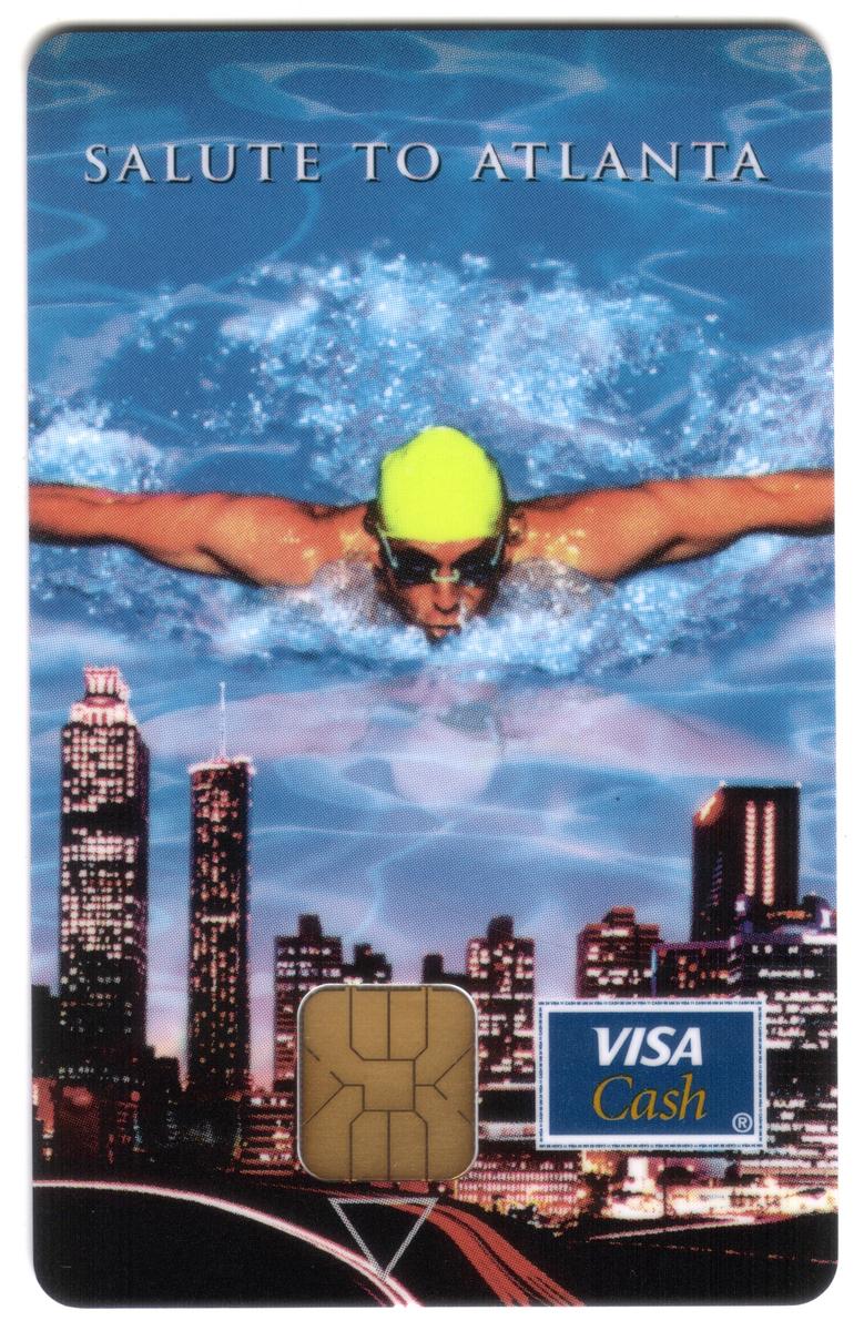 This is a Visa Cash Card featuring a promotional design titled "Salute to Atlanta." The card displays a swimmer wearing a bright yellow swim cap who is performing the butterfly stroke. The swimmer is shown mid-stroke with arms outstretched and water splashing around their head and shoulders.