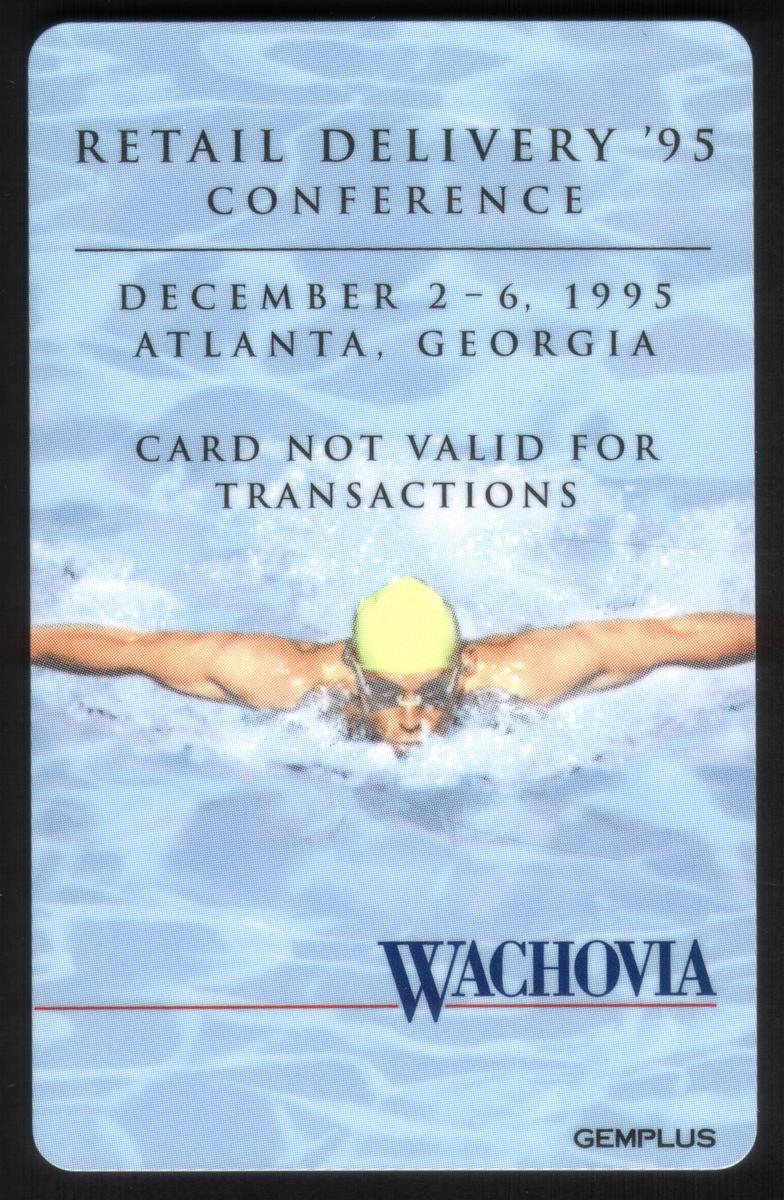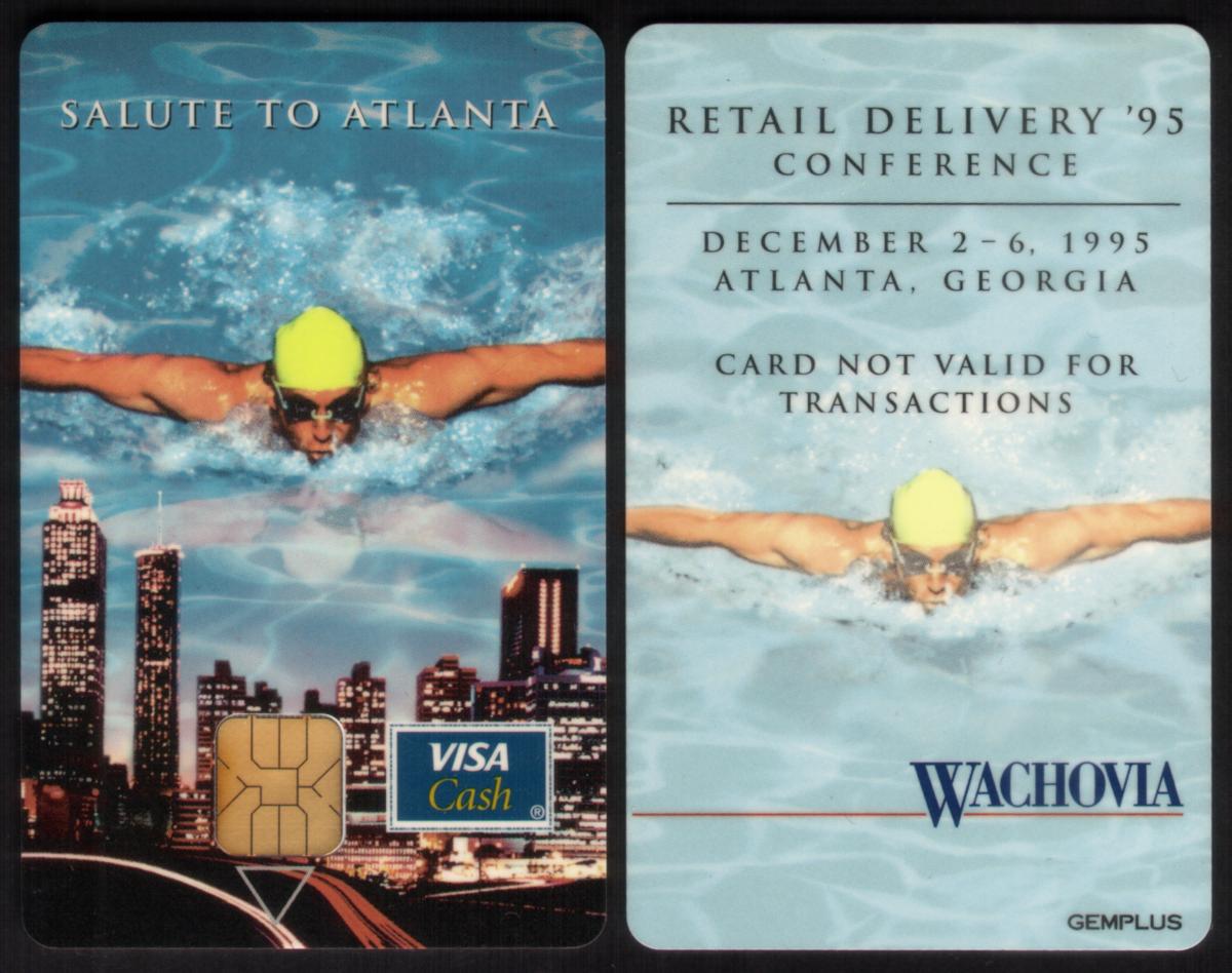 The phrase "SALUTE TO ATLANTA" is written in uppercase letters near the top center of the card above the swimmer. This card is associated with the Wachovia Corporation, linked to a retail delivery conference promo. The design clearly relates to watersports and swimming, specifically honoring the city of Atlanta.