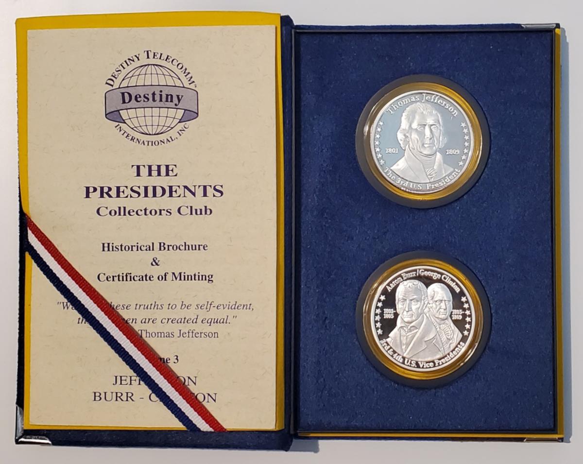 Keywords: Americana, collectibles, coins, coin collecting, numismatics, currency, money, American Presidents, Thomas Jefferson, silver coins, medals, American history, aaron burr, george clinton, 1 oz .999 silver, Destiny Telecomm