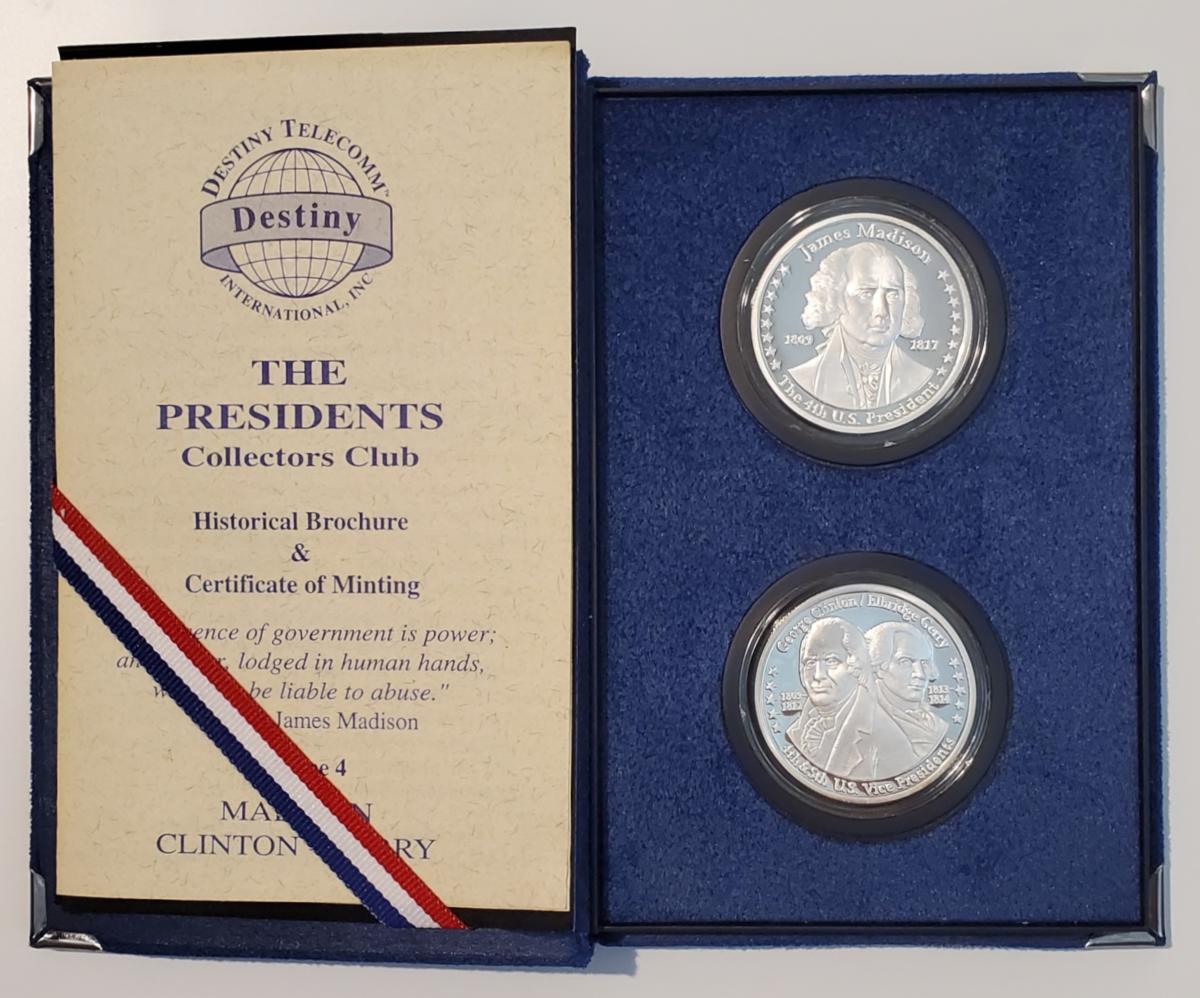 Overall, the collectible combines themes of Americana, coin collecting, and currency, specifically silver coins featuring American Presidents James Madison and George Clinton. The card is designed for collectors interested in American history and numismatics, presenting these figures through the medium of high-purity silver coins.