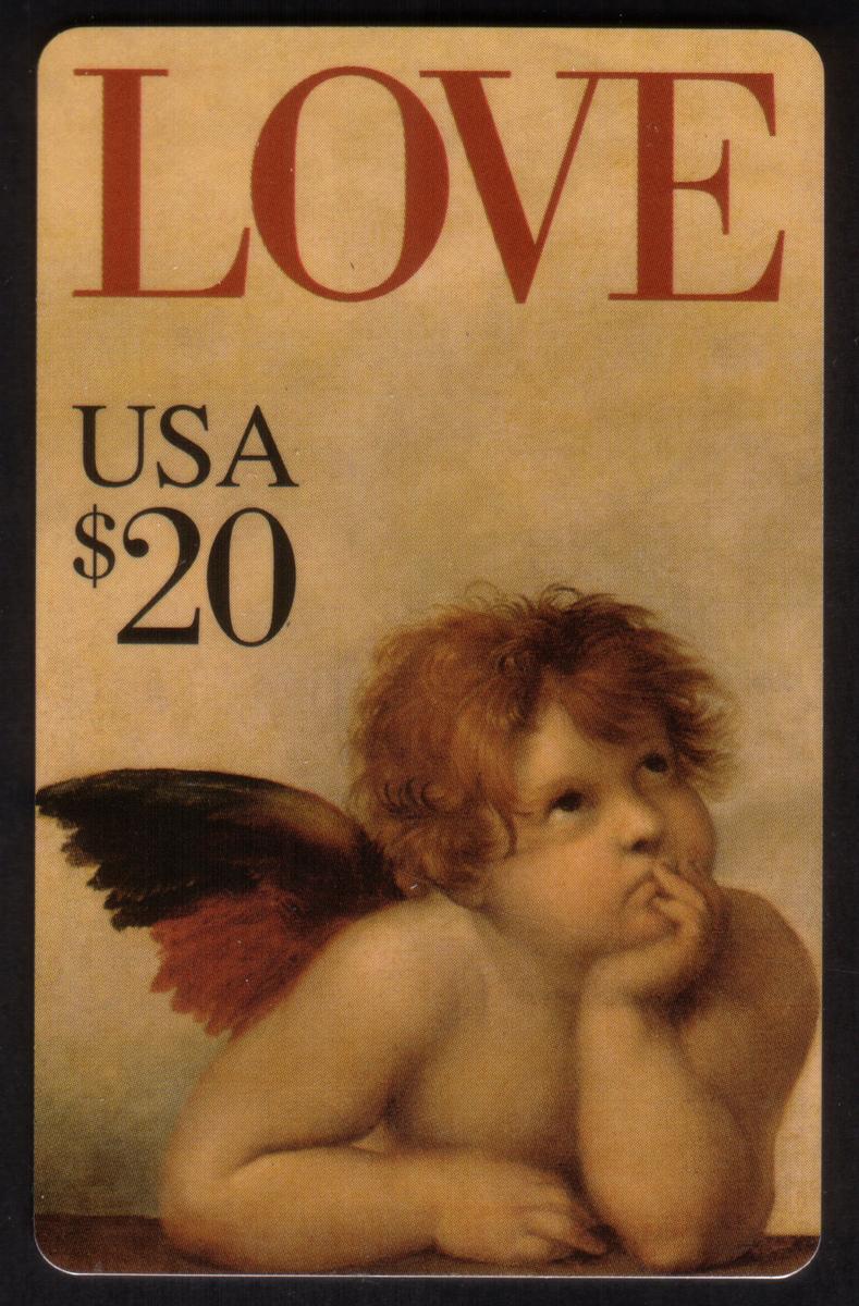 This collectible phone card features the Cherub Love Postage Stamp issued by the United States Postal Service (USPS). The design prominently showcases two cherubs, depicted as young angelic children with wings, embracing each other tenderly. The illustration captures a classic, religious-themed portrayal of cherubs, adding an angelic and biblical element to the card’s artwork.