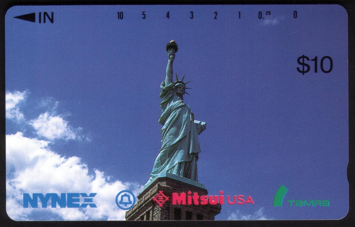 Statue of Liberty image, $10 value, featuring NYNEX and Mitsui logos, with usage instructions; a nostalgic tribute to American heritage and communication history. |